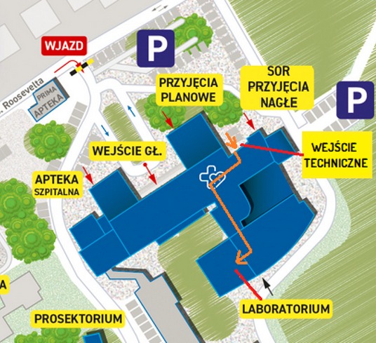 Osoby udające się do laboratorium powinny korzystać z wejścia technicznego, usytuowanego pomiędzy Szpitalnym Oddziałem Ratunkowym (SOR) a Nocną i Świąteczną Opieką Zdrowotną (NiŚOZ). Placówka udostępniła pacjentom mapę oraz fotografie, które mają ułatwić odnalezienie nowej drogi dojścia.