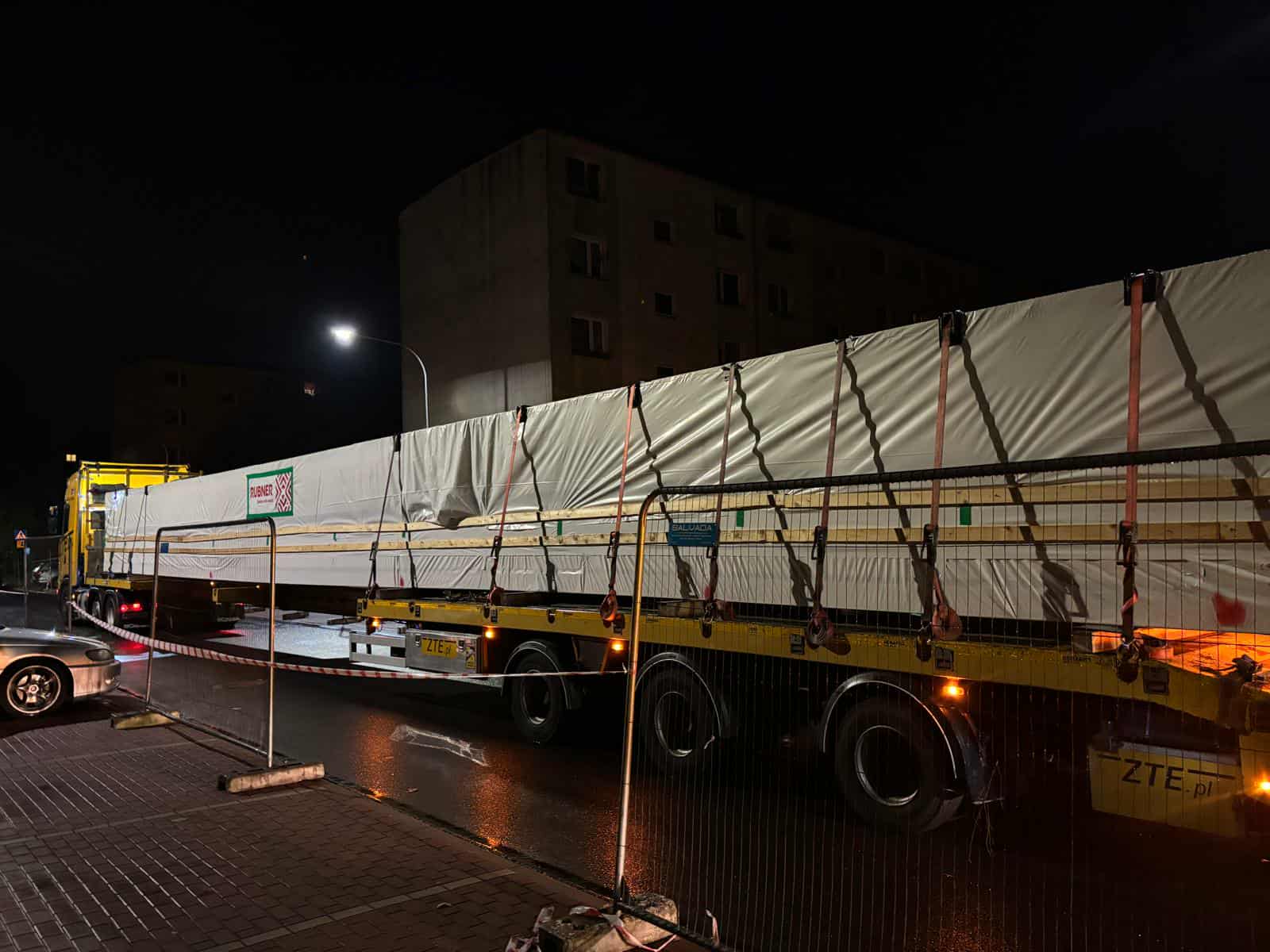 Transport, z ładunkiem o długości ponad 30 metrów, był nie lada wyzwaniem logistycznym. Samo jego rozładowanie i wprowadzenie na teren budowy wymagało użycia 130-tonowego dźwigu i zajęło kilka godzin. Operacja przebiegała jednak wyjątkowo sprawnie.
