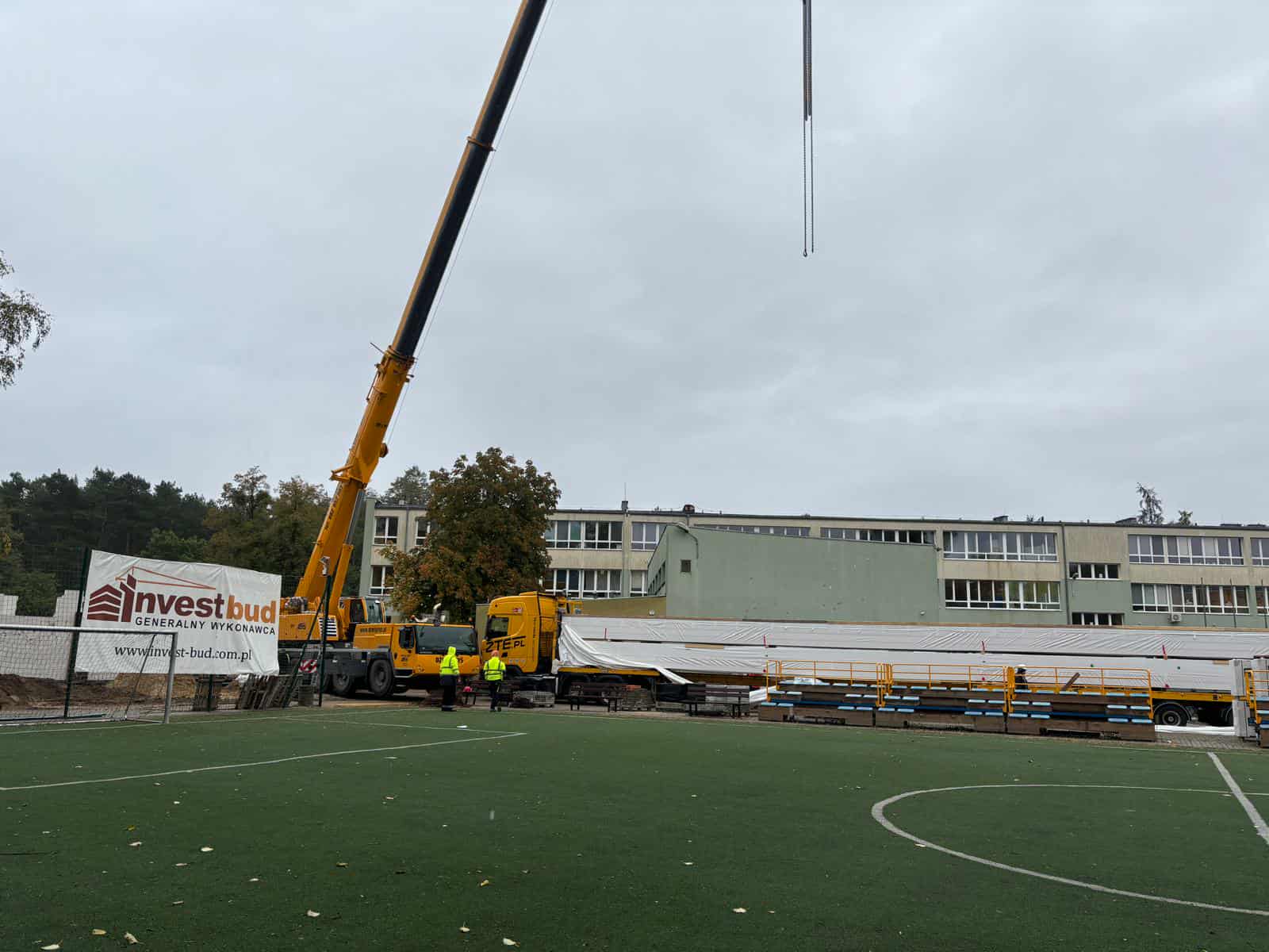 Drewniane przęsła zostały już rozładowane na placu budowy, a ich montaż zaplanowano na najbliższe 2–3 tygodnie. Wówczas konstrukcja hali zacznie nabierać ostatecznych kształtów.