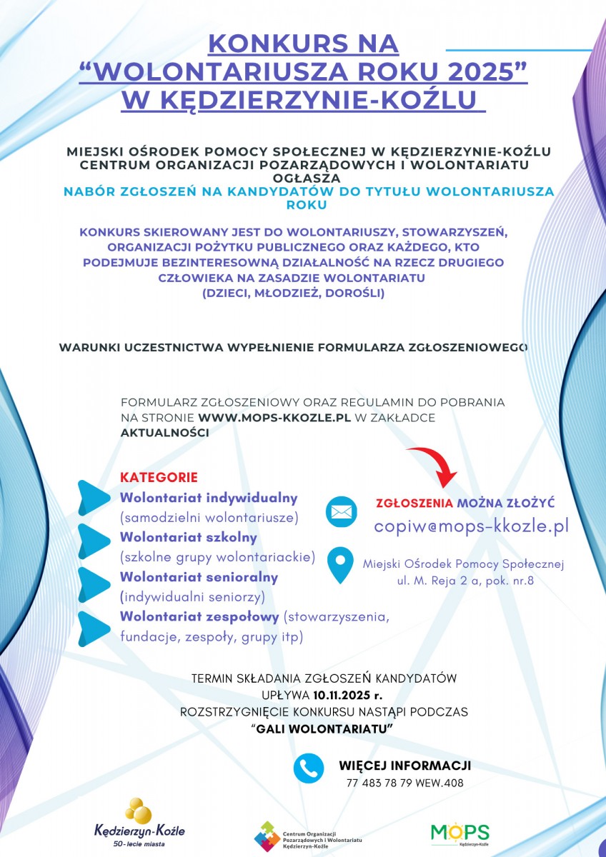 Konkurs skierowany jest do wszystkich, niezależnie od wieku: dzieci, młodzieży, dorosłych i seniorów, a także do grup wolontariackich, stowarzyszeń i fundacji. Zgłoszenia przyjmowane są w czterech kategoriach: wolontariat indywidualny, szkolny, senioralny oraz zespołowy. Aby zgłosić kandydata, wystarczy wypełnić formularz dostępny na stronie www.mops-kkozle.pl w zakładce „Aktualności”.