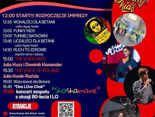Program imprezy rozpocznie się o godz. 12.00. Na scenie wystąpią m.in. soliści Agaty Seidel, zespół taneczny FUNKY KIDS, a także uczestnicy programów „The Voice Kids” i „The Voice of Poland”. Nie zabraknie również pokazów wolontariatu i chóru „One Love Choir”. Zwieńczeniem wydarzenia będzie koncert zespołu Shashamani, zaplanowany na godz. 17.00.
