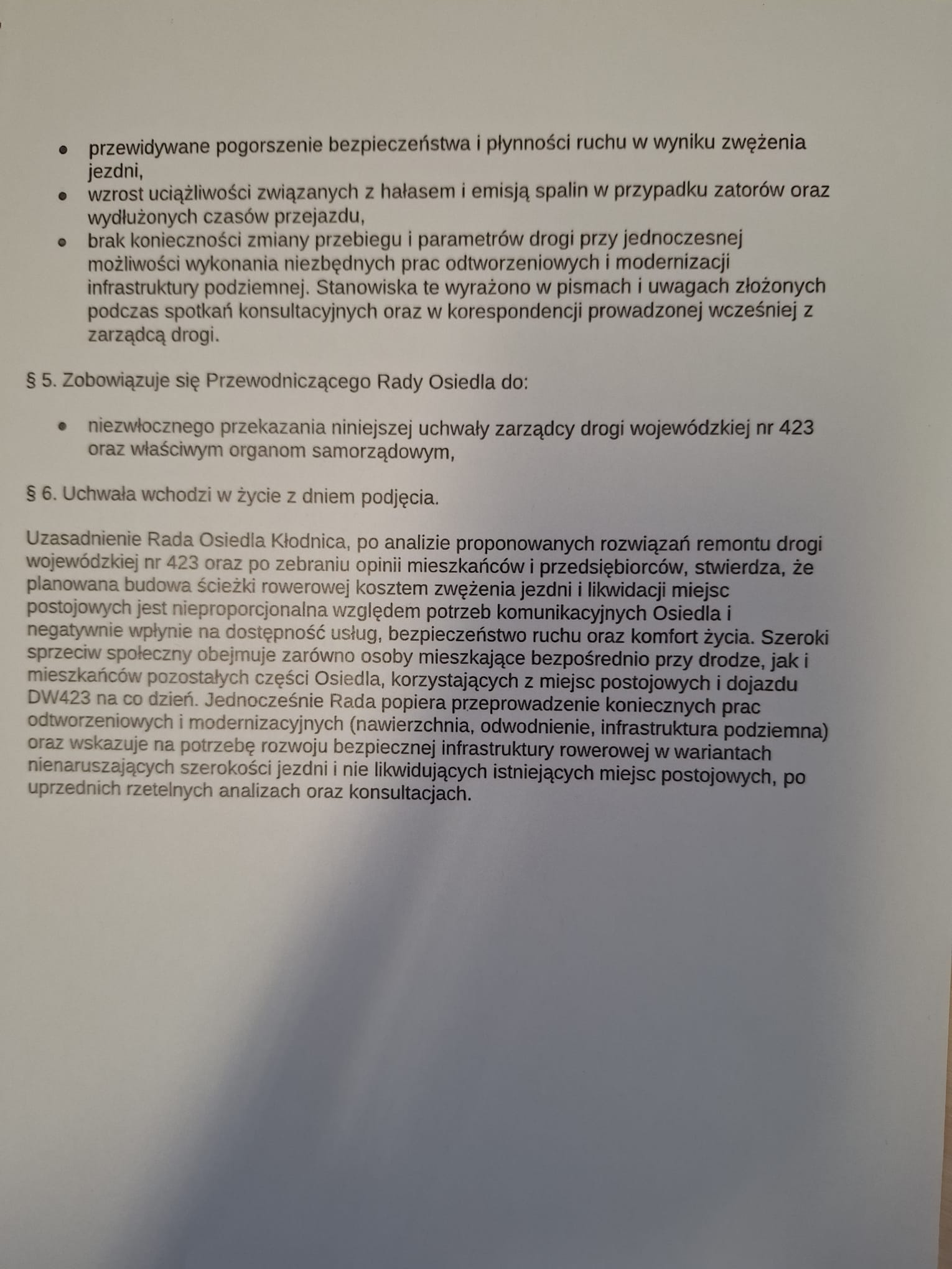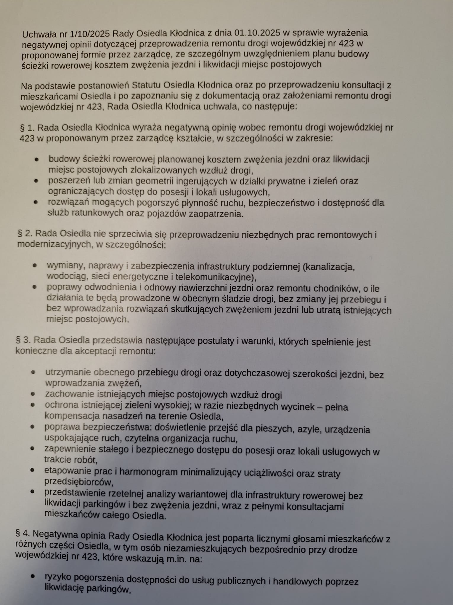W uzasadnieniu uchwały podkreślono, że społeczny sprzeciw wobec projektu ma szeroki charakter i obejmuje nie tylko mieszkańców ulicy Kłodnickiej, ale również innych części osiedla, dla których droga wojewódzka nr 423 jest główną arterią dojazdową.