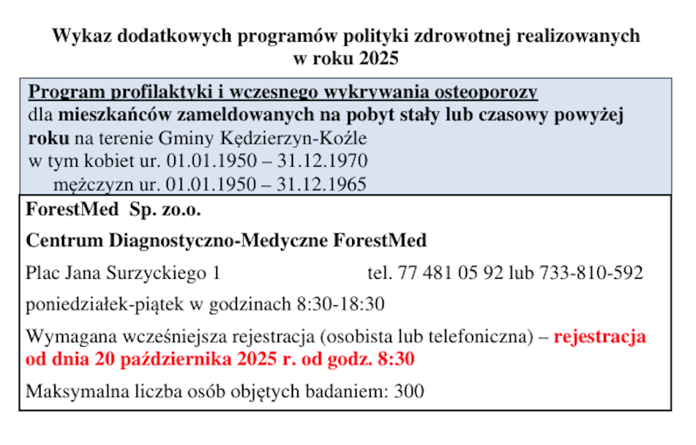 Badania realizowane są przez Centrum Diagnostyczno-Medyczne ForestMed Sp. z o.o. znajdujące się przy Placu Jana Surzyckiego 1. Obowiązuje rejestracja osobista bądź telefoniczna pod numerami telefonu: 77 481 05 92 lub 733 810 592. Liczba miejsc jest ograniczona. Z programu może skorzystać 300 osób.