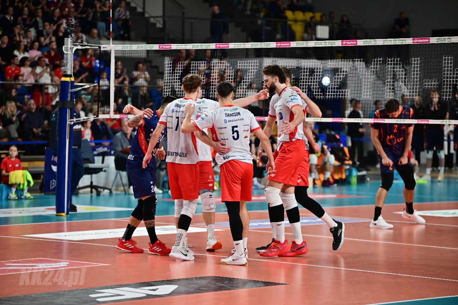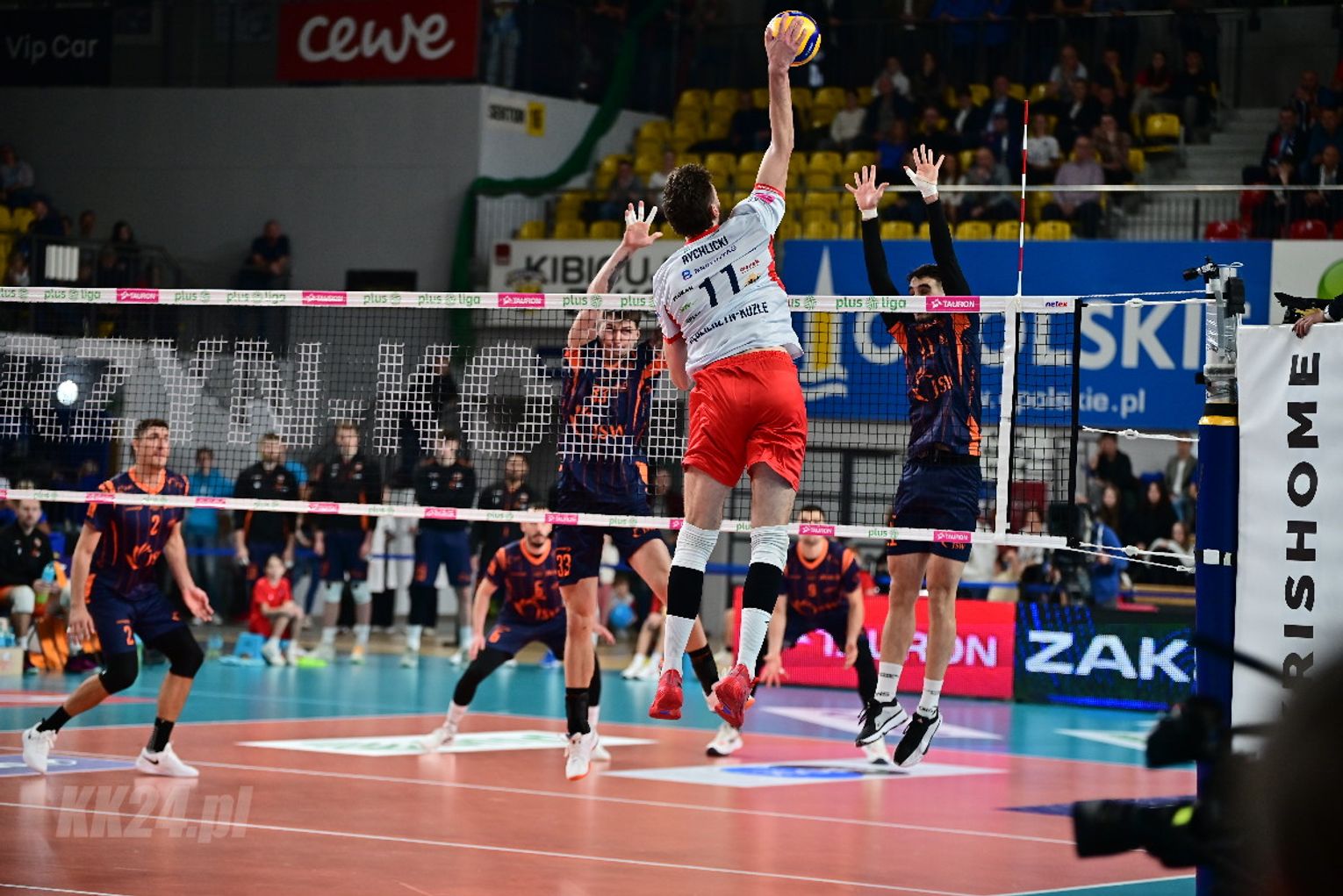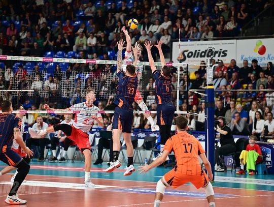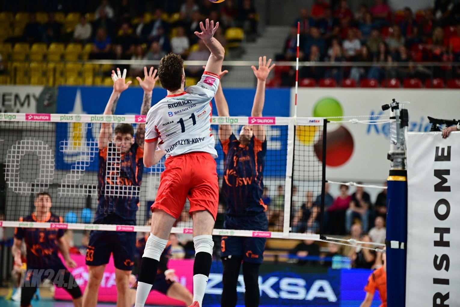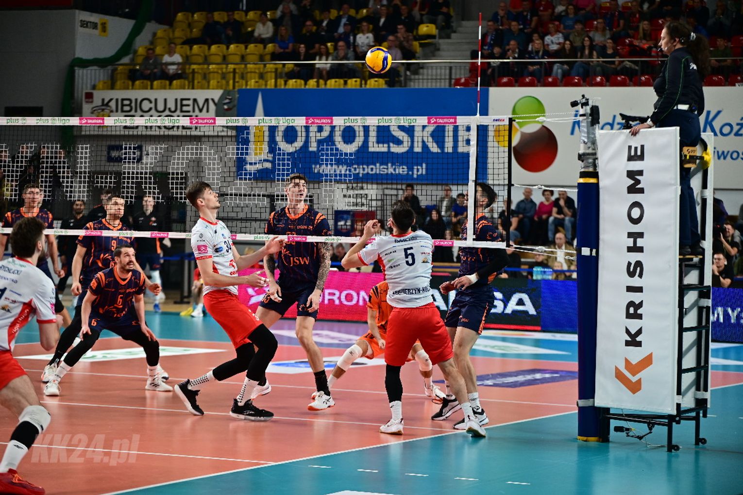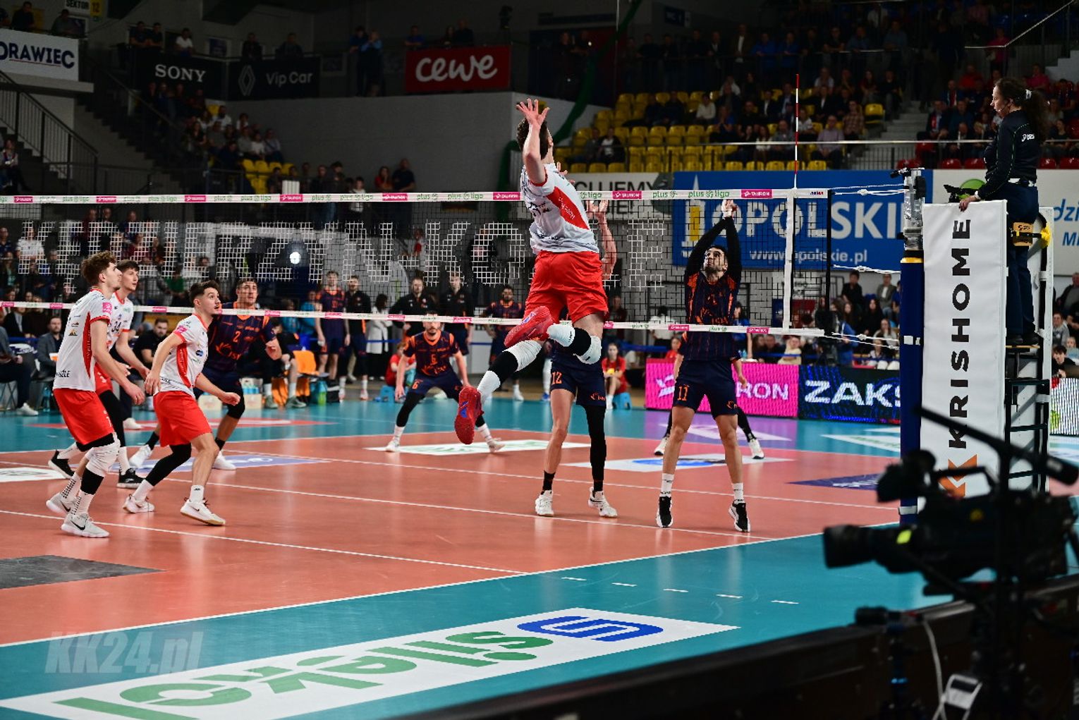 Po falstarcie w odsłonie trzeciej i prowadzeniu rywali 7:3 nasz zespół przystąpił do odrabiania strat. Jastrzębianie mieli problemy z przyjęciem zagrywek Quinna Isaacsona, kolejne punktowe bloki naszego zespołu pozwoliły zniwelować dystans (7:9). Niestety nie było to ostatnie słowo gości, również nasza drużyna nie ustrzegła się problemów w przyjęciu, punktowe zagrywki Bena Toniuttiego (7:12). Przy zmienności sytuacji kolejno odrabialiśmy straty (11:12), aby przy błędach własnych pozwolić uciec rywalom ponownie (11:14). Podobnie jak w drugiej partii meczu również tym razem podopieczni Andrei Gianiego przystąpili do ataku. Nie do zatrzymania w tej części meczu był Kamil Rychlicki, nasz atakujący zapunktował również blokiem, odzyskując kontakt punktowy na 13:14. Chwilę później kolejny punktowy blok naszego zespołu dał nam wyrównanie (17:17). Od tego momentu żadna z ekip nie była w stanie wypracować wyższego prowadzenia (21:21). Mimo trudnej końcówki nasz zespół po raz kolejny pokazał waleczność i charakter, w rywalizacji rozstrzyganej na przewagi czujna gra w bloku Quinna Isaacsona i ataki Igora Grobelnego wyprowadziły nas na prowadzenie (26:25). Seta i całe spotkanie zakończył Karol Urbanowicz (27:25).