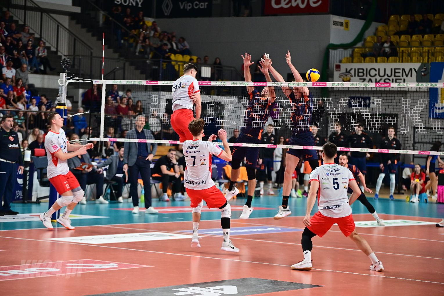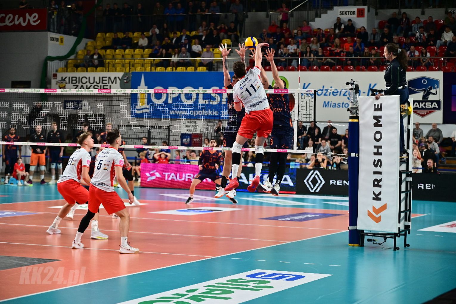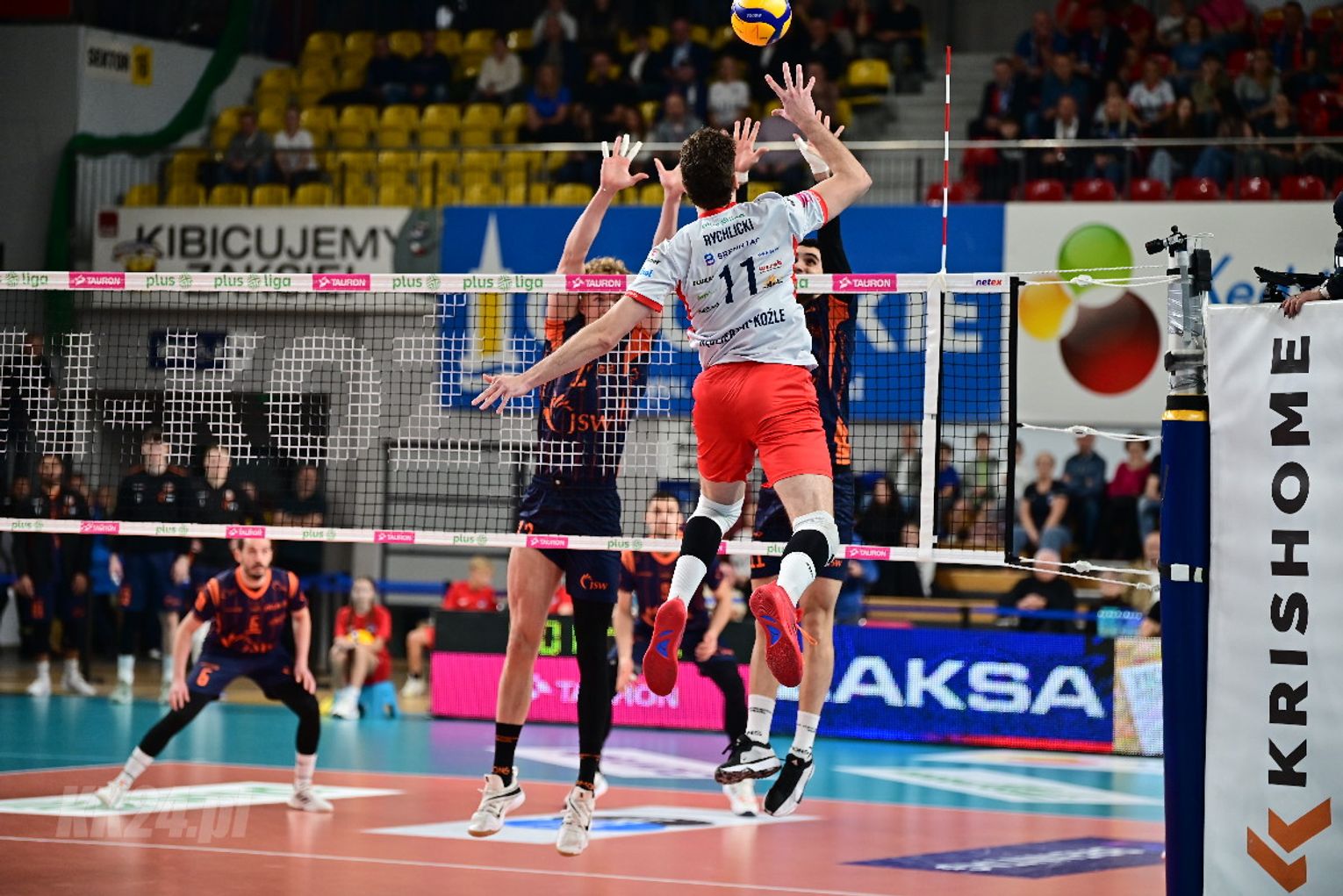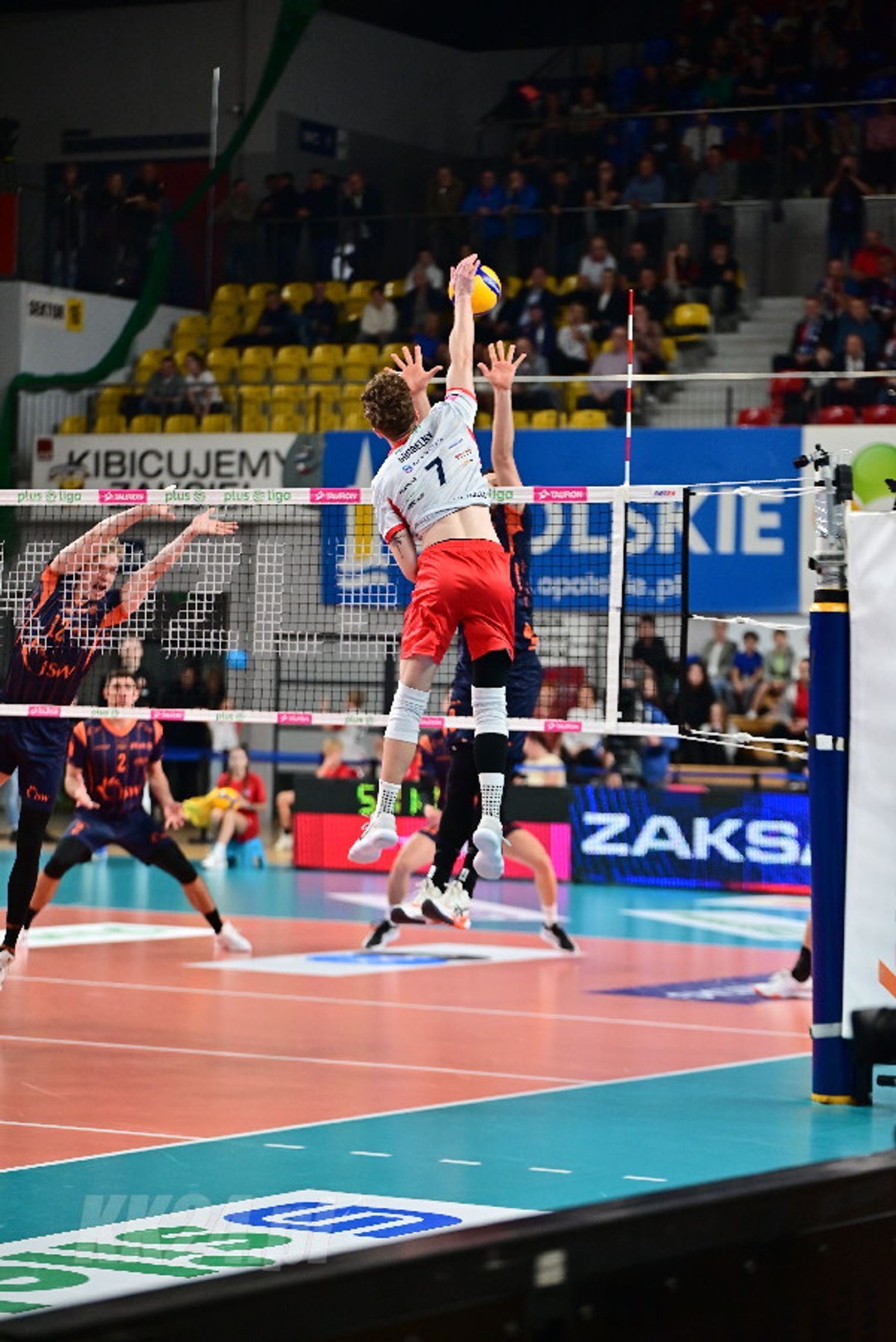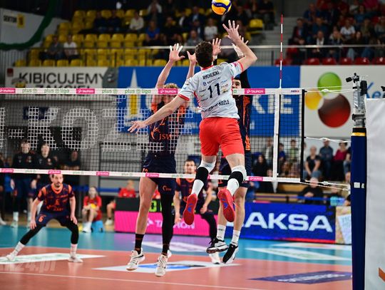 Po falstarcie w odsłonie trzeciej i prowadzeniu rywali 7:3 nasz zespół przystąpił do odrabiania strat. Jastrzębianie mieli problemy z przyjęciem zagrywek Quinna Isaacsona, kolejne punktowe bloki naszego zespołu pozwoliły zniwelować dystans (7:9). Niestety nie było to ostatnie słowo gości, również nasza drużyna nie ustrzegła się problemów w przyjęciu, punktowe zagrywki Bena Toniuttiego (7:12). Przy zmienności sytuacji kolejno odrabialiśmy straty (11:12), aby przy błędach własnych pozwolić uciec rywalom ponownie (11:14). Podobnie jak w drugiej partii meczu również tym razem podopieczni Andrei Gianiego przystąpili do ataku. Nie do zatrzymania w tej części meczu był Kamil Rychlicki, nasz atakujący zapunktował również blokiem, odzyskując kontakt punktowy na 13:14. Chwilę później kolejny punktowy blok naszego zespołu dał nam wyrównanie (17:17). Od tego momentu żadna z ekip nie była w stanie wypracować wyższego prowadzenia (21:21). Mimo trudnej końcówki nasz zespół po raz kolejny pokazał waleczność i charakter, w rywalizacji rozstrzyganej na przewagi czujna gra w bloku Quinna Isaacsona i ataki Igora Grobelnego wyprowadziły nas na prowadzenie (26:25). Seta i całe spotkanie zakończył Karol Urbanowicz (27:25).