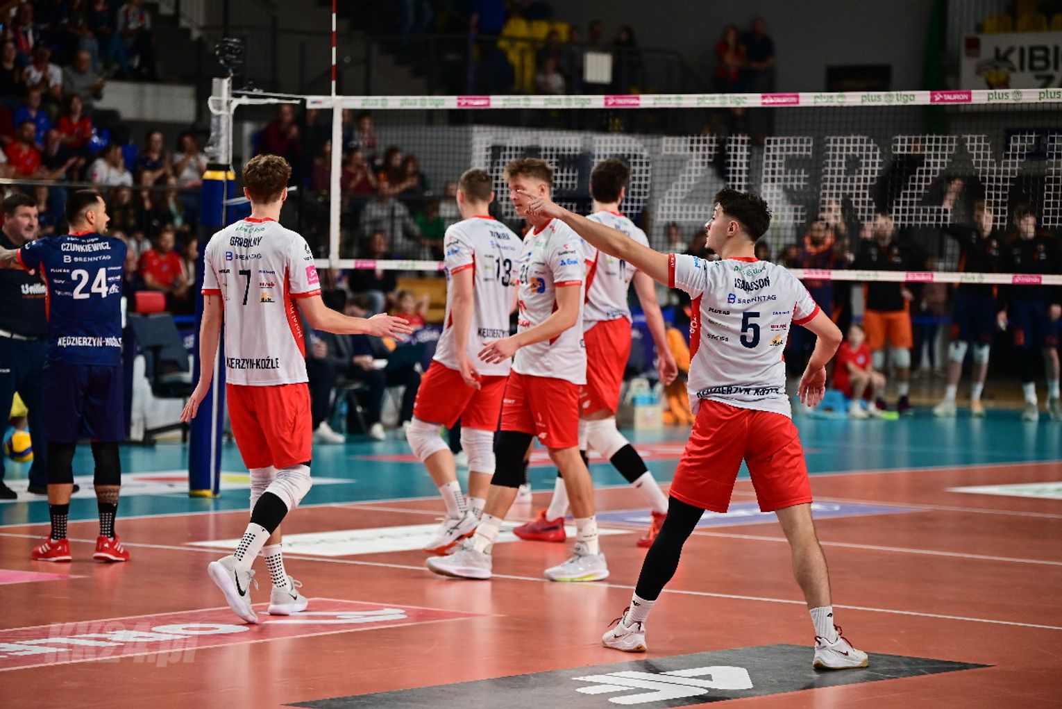 Spotkanie rozpoczęło się po myśli naszego zespołu, Quinn Isaacson dość szybko uruchomił grę przez środek, a tam nie zawodził Szymon Jakubiszak. Na skrzydłach kolejne akcje kończył Igor Grobelny, co przy zagraniach Kujundzicia z Szerszeniem sprzyjało utrzymywaniu gry na styku (6:6). Niestety nie ustrzegliśmy się nerwowości, co pozwoliło ekipie trenera Kowala nieco odskoczyć (7:9). Przerwa na żądanie naszego trenera pomogła, znakomity atak Karola Urbanowicza i zagrywka naszego środkowego doprowadziły do wyrównania (9:9). Rywale nie ustrzegli się też błędów własnych i po zerwanych ataku Szerszenia odzyskaliśmy prowadzenie. Przez chwilę utrzymywała się gra punkt za punkt, jednak to nasz zespół szybciej przystąpił do ataku. Po punktowym bloku na Kaczmarku prowadziliśmy 14:13, aby po chwili powstrzymać na skrzydle również Kujundzicia. Skuteczna gra naszego zespołu i kolejne kontrataki zwiększyły dystans i Andrzej Kowal ponownie przywołał swoich podopiecznych do siebie (20:16). Nie zatrzymało to naszej drużyny, pewność w ataku Kamila Rychlickie, a w kluczowej fazie seta seria zagrywek naszego atakującego okazały się kluczem do sukcesu (23:16). Tej zaliczki nie pozwoliliśmy sobie już odebrać, kropkę nad „i” sprytnie obijając blok przeciwnika postawił Rafał Szymura (25:16).