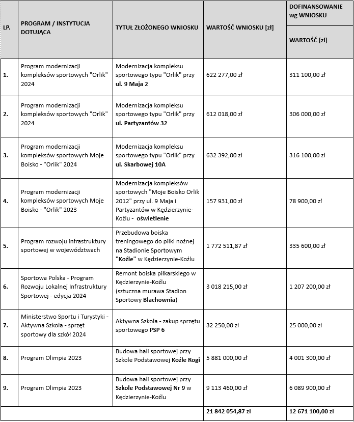 Warto jednak podkreślić, że to nie jedyne środki pozyskane przez nasze miasto z Ministerstwa Sportu i Turystyki. Tylko w tym roku gmina zdobyła blisko 12,7 miliona złotych! Dodatkowo dzięki temu zmodernizowano wszystkie miejskie orliki, powstają dwie sale gimnastyczne przy szkołach podstawowych, zakupiono sprzęt sportowy dla placówek oświatowych oraz zabezpieczono środki na remont boiska na stadionie w Blachowni.