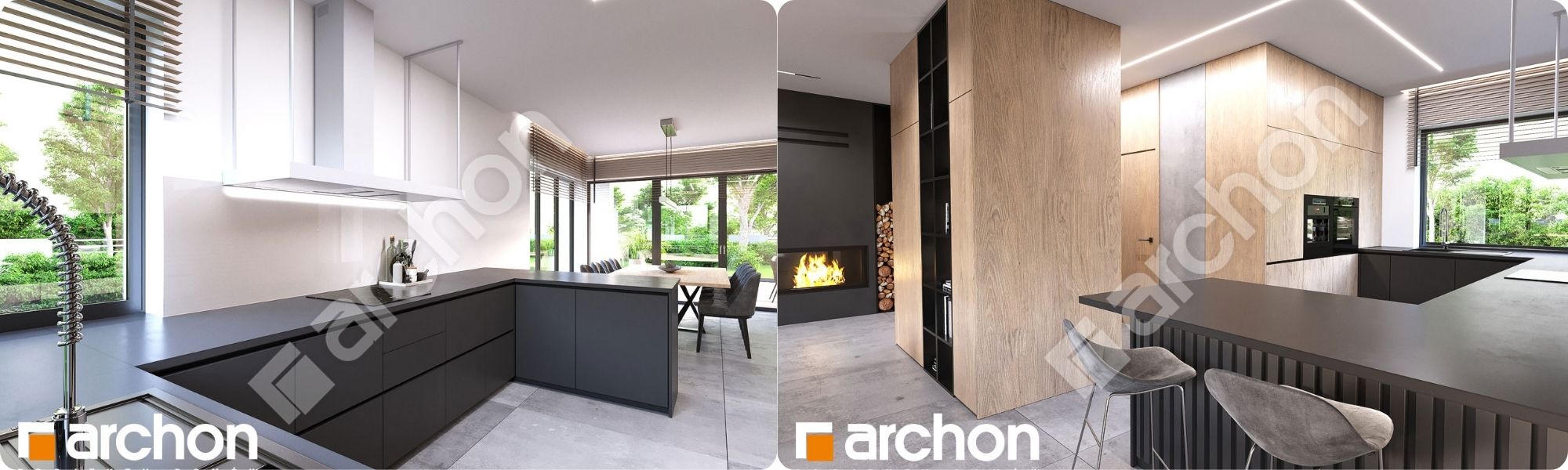 Na wizualizacjach zaprezentowano nowoczesną aranżację: dominują grafitowe fronty w połączeniu z jasnymi, gładkimi powierzchniami i minimalistycznymi detalami. Długi, jednolity blat zapewnia komfort pracy, a proste, nowoczesne oświetlenie nadaje całości eleganckiego charakteru. Przy barku, który umownie wyznacza granicę kuchni, ustawiono wysokie, tapicerowane hokery, tworząc wygodne miejsce do śniadań.