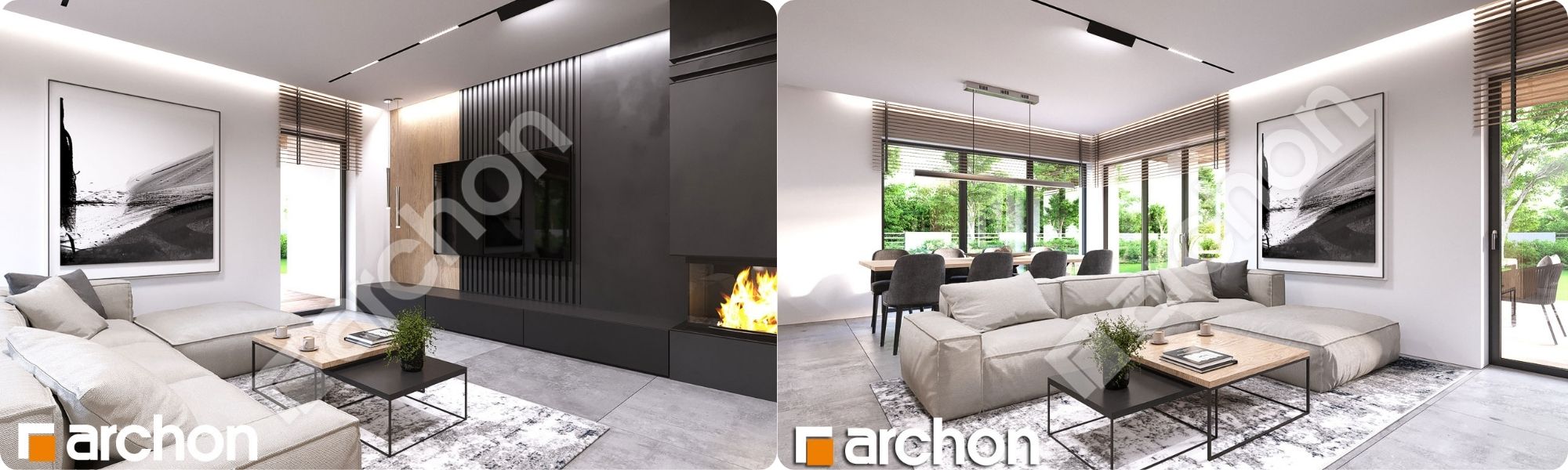 Sercem domu jest przestronna strefa dzienna – salon z kominkiem i słoneczna jadalnia tworzą ponad 34 m² wspólnej przestrzeni, idealnej do codziennego życia i spotkań w większym gronie. W aranżacji przedstawionej na wizualizacjach dominuje jasna, nowoczesna estetyka, oparta na połączeniu bieli z delikatną szarością i antracytem, które przełamują akcenty drewna. Głównym punktem salonu jest duża sofa narożna, towarzyszy jej lekki stolik kawowy o drewnianym blacie i czarnej, minimalistycznej konstrukcji, a całość dopełnia wzorzysty dywan, który dodaje przytulności. Klimat wnętrza podkreślają dodatki, zieleń roślin oraz nastrojowe, liniowe oświetlenie, akcentujące nowoczesny charakter przestrzeni.