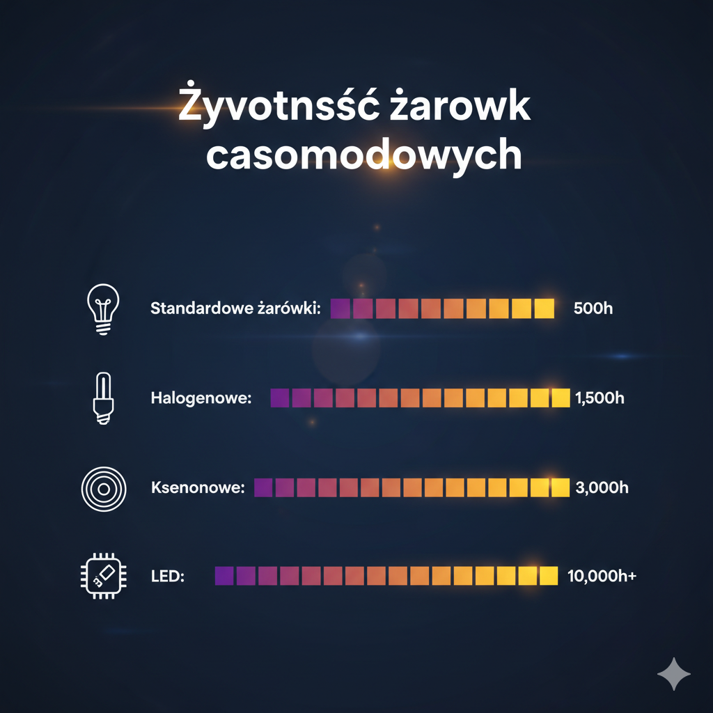 Żywotność zależy od typu oświetlenia: standardowe żarówki wytrzymują około 500 godzin, halogenowe 1500 godzin, ksenonowe 3000 godzin, a LED ponad 10 000 godzin. Nie czekaj jednak na całkowite przepalenie – jeśli zauważysz spadek jasności lub zmianę barwy światła na żółtawą, wymień lampy natychmiast.