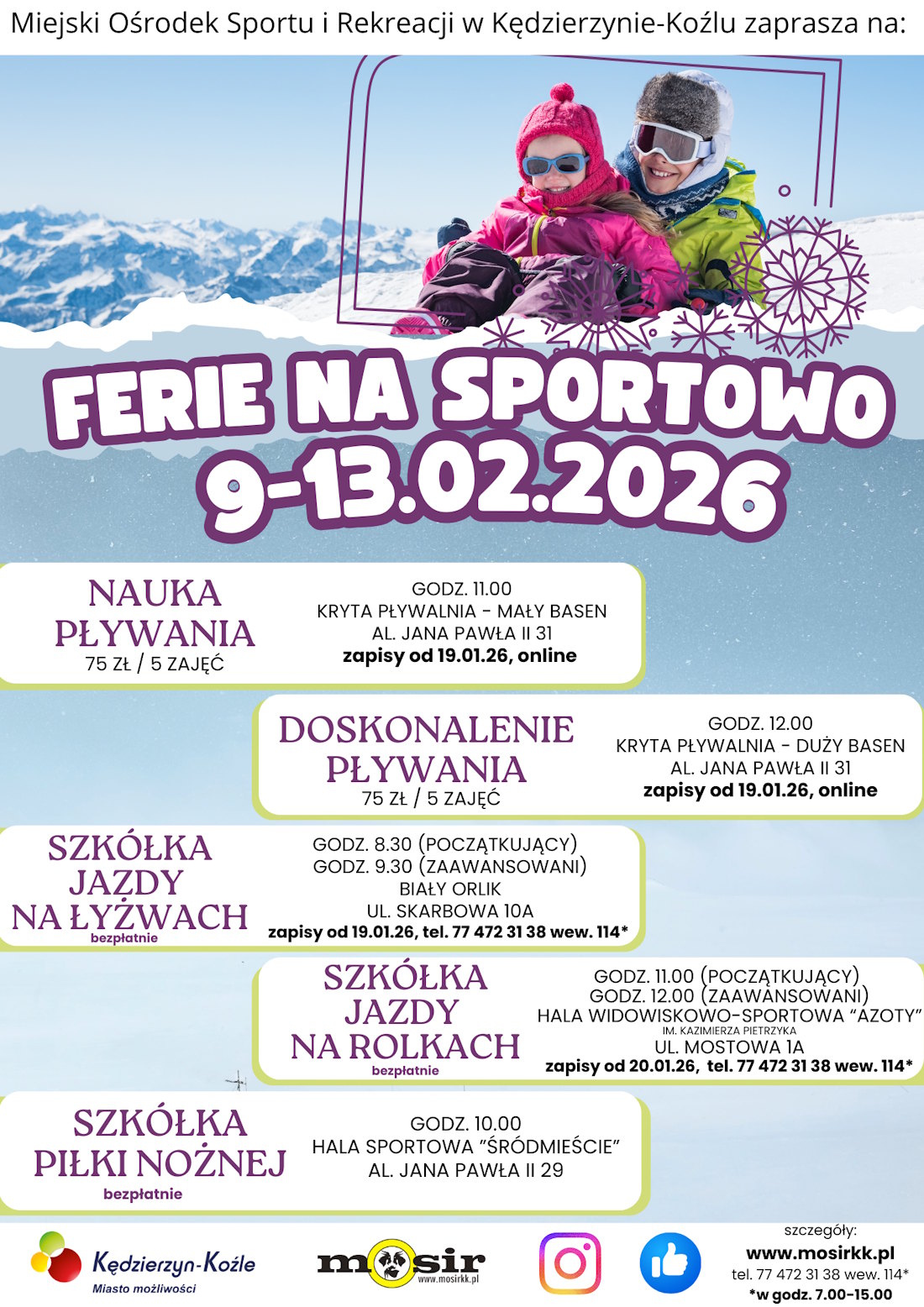 Szczegółowy harmonogram zajęć, godziny oraz zasady uczestnictwa dostępne są na stronie internetowej Miejskiego Ośrodka Sportu i Rekreacji. Organizatorzy zachęcają dzieci i młodzież do aktywnego spędzenia ferii oraz skorzystania z przygotowanych atrakcji. Informacje na temat zajęć można uzyskać również telefonicznie, dzwoniąc w godzinach 7-15 pod numer 77 472 31 38, wew. 114.