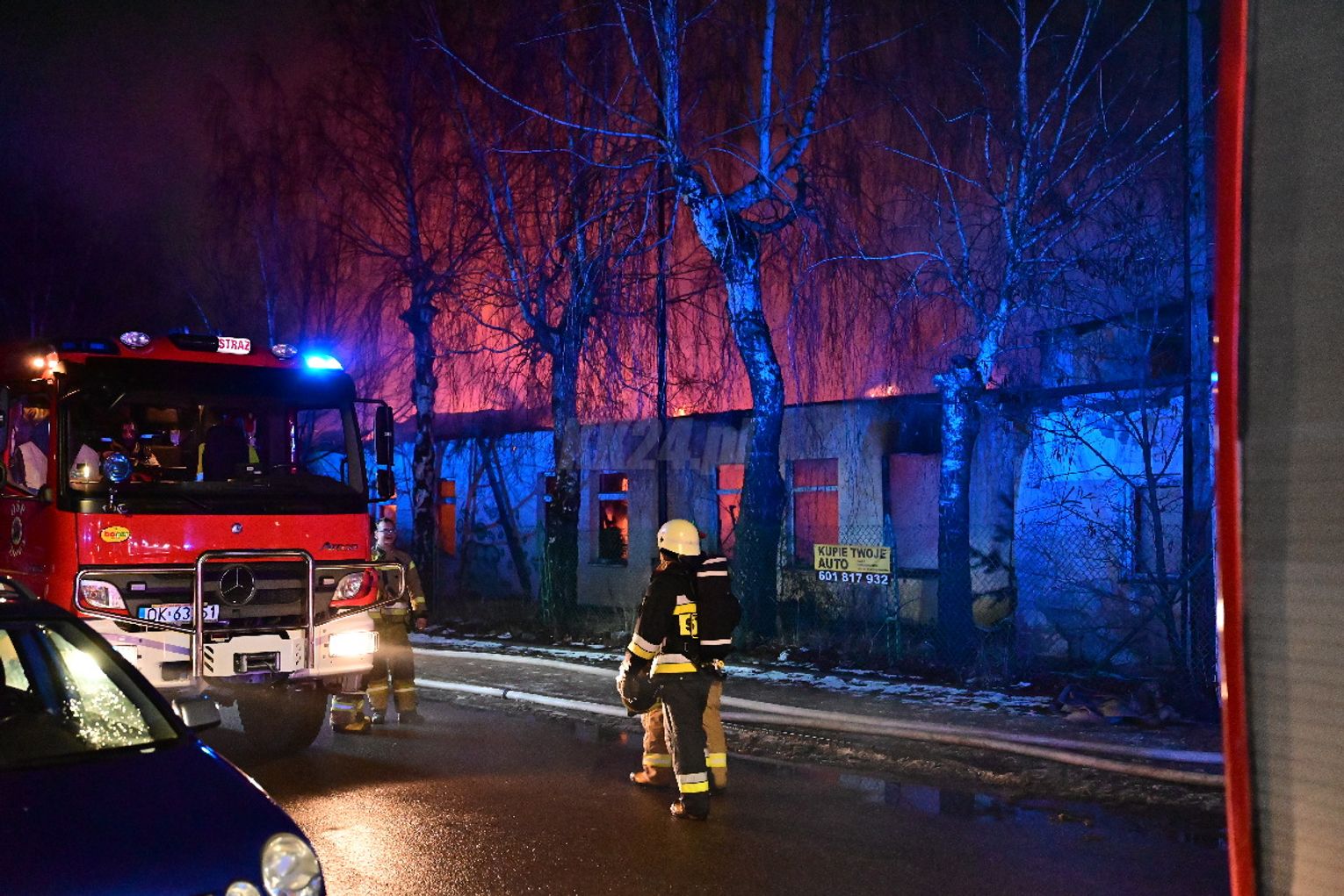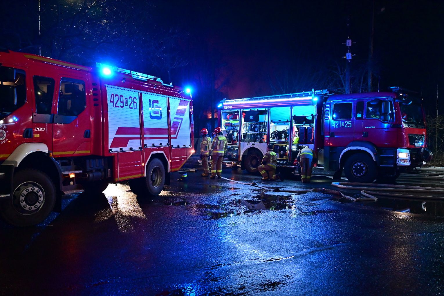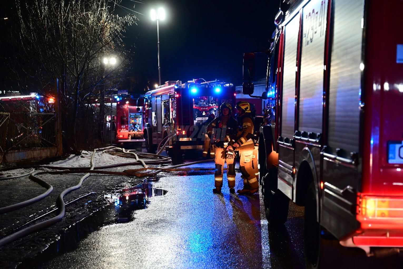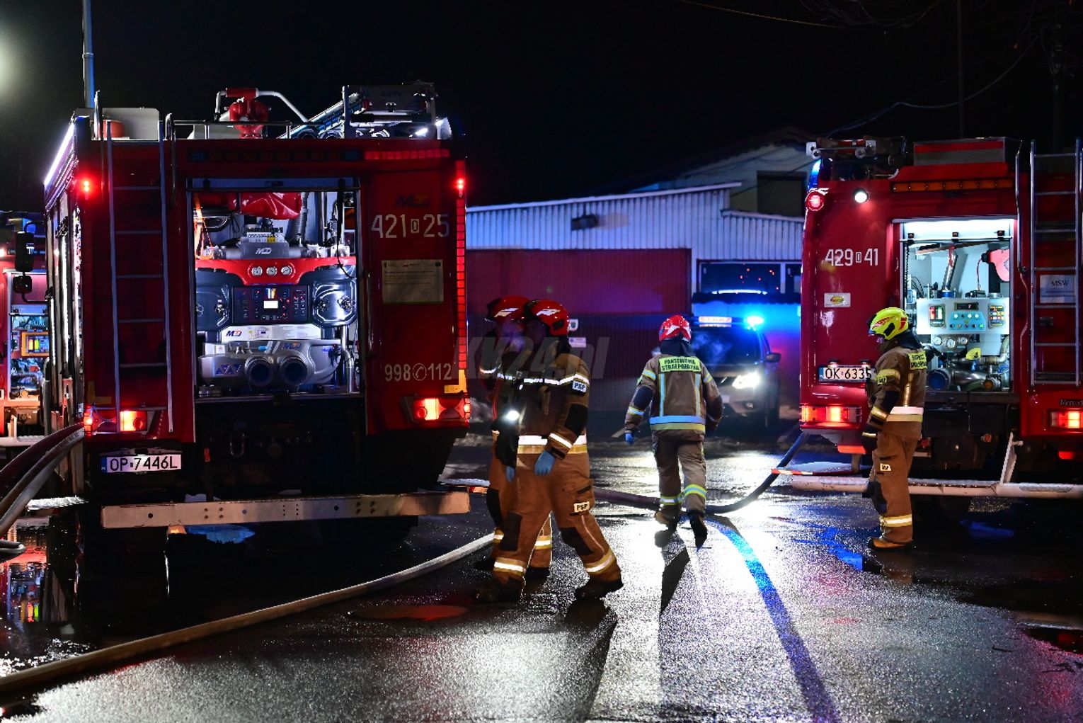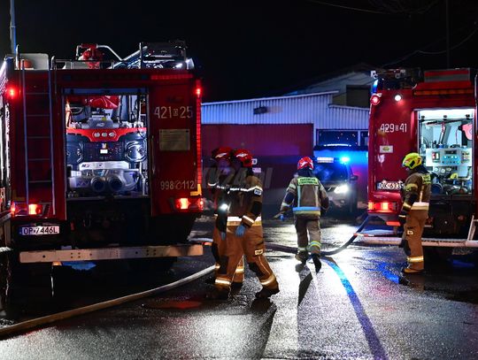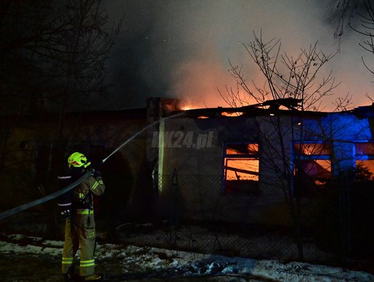 Po dojeździe pierwszych zastępów okazało się, że ogniem objęte są dwa budynki, w tym opuszczona hala. Pożar był dobrze rozwinięty, co wymagało zaangażowania kilkunastu zastępów straży pożarnej z terenu całego powiatu. Działania strażaków koncentrowały się na gaszeniu płomieni oraz niedopuszczeniu do rozprzestrzenienia się ognia na sąsiednie obiekty. Wstępnie nie odnotowano osób poszkodowanych. Ze wstępnych ustaleń wynika, że pożar mógł być wynikiem celowego podpalenia. Okoliczności zdarzenia będą wyjaśniane przez odpowiednie służby.