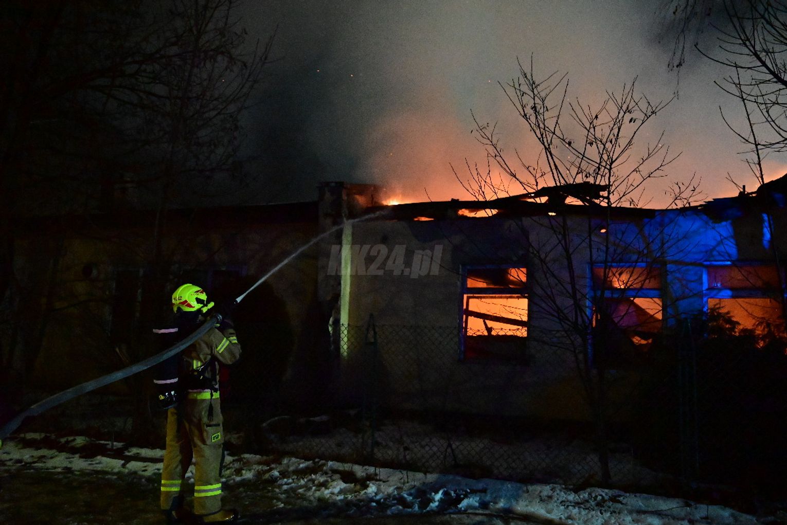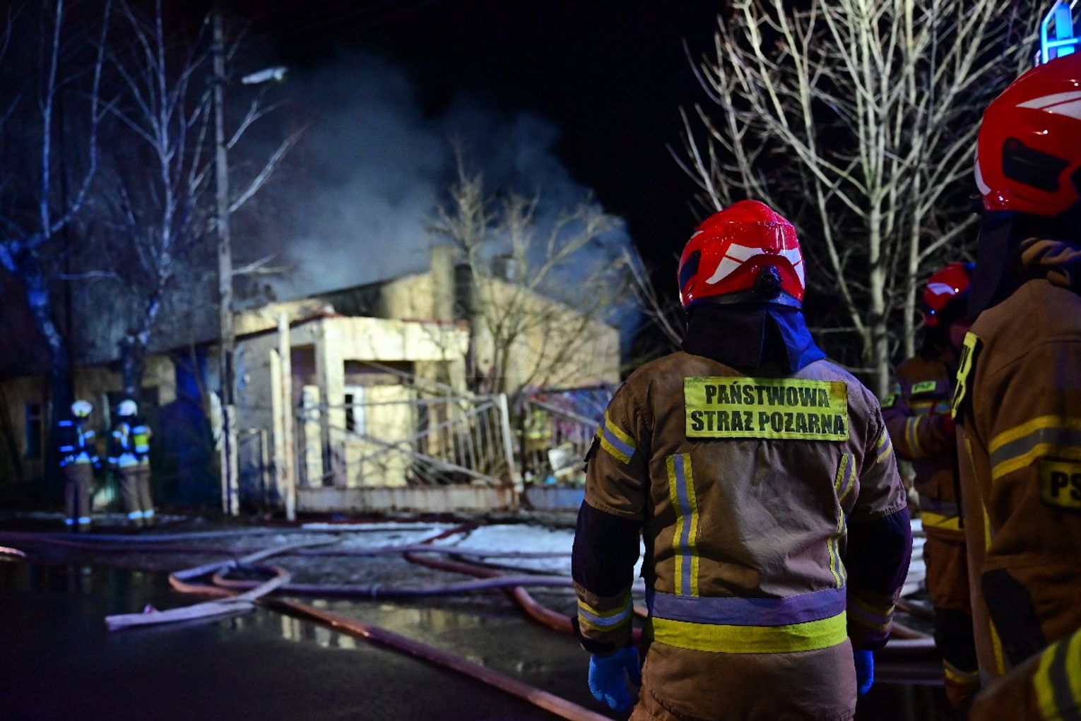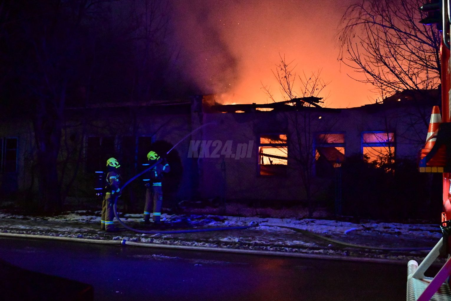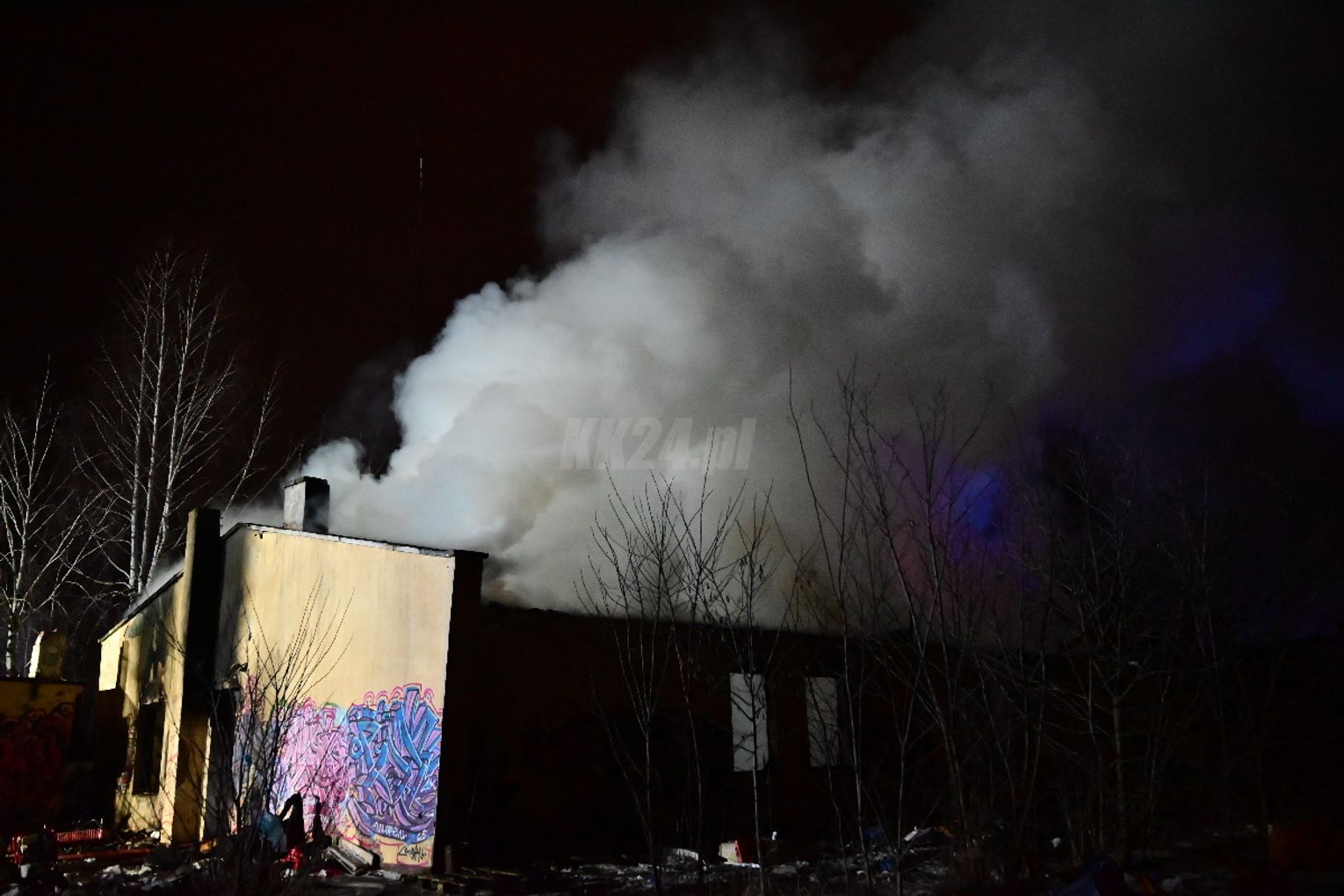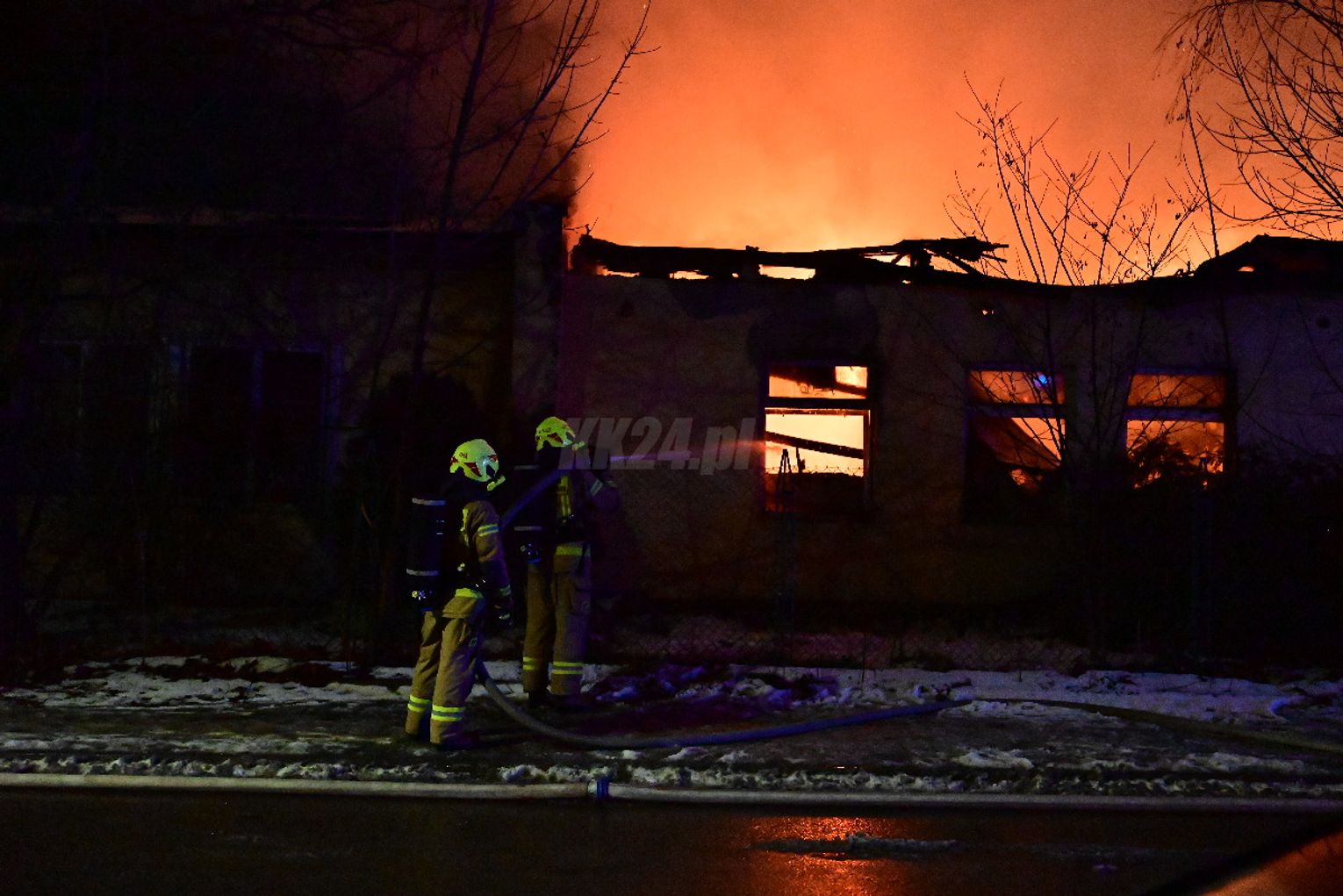 Po dojeździe pierwszych zastępów okazało się, że ogniem objęte są dwa budynki, w tym opuszczona hala. Pożar był dobrze rozwinięty, co wymagało zaangażowania kilkunastu zastępów straży pożarnej z terenu całego powiatu. Działania strażaków koncentrowały się na gaszeniu płomieni oraz niedopuszczeniu do rozprzestrzenienia się ognia na sąsiednie obiekty. Wstępnie nie odnotowano osób poszkodowanych. Ze wstępnych ustaleń wynika, że pożar mógł być wynikiem celowego podpalenia. Okoliczności zdarzenia będą wyjaśniane przez odpowiednie służby.