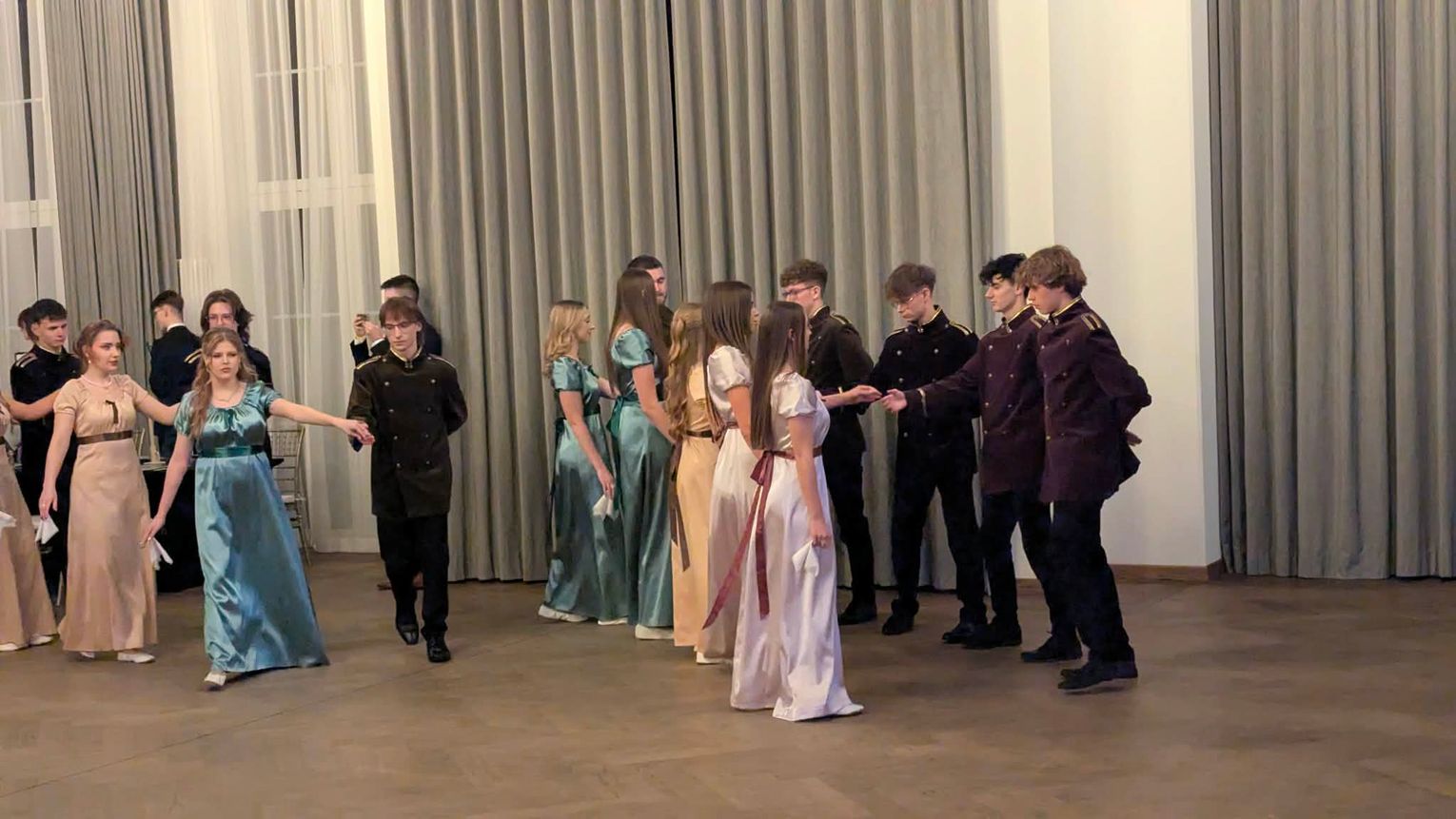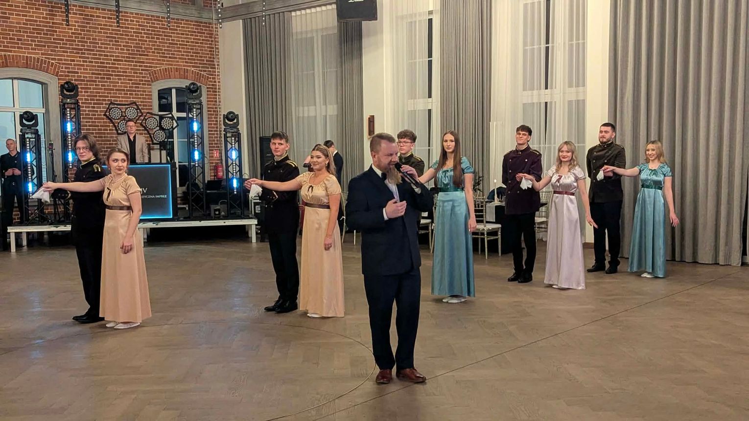 Uroczystość tradycyjnie rozpoczęła się polonezem. W pierwszej części został on zatańczony w strojach nawiązujących do dawnych epok, z czasów, gdy był on jednym z najważniejszych tańców balowych.