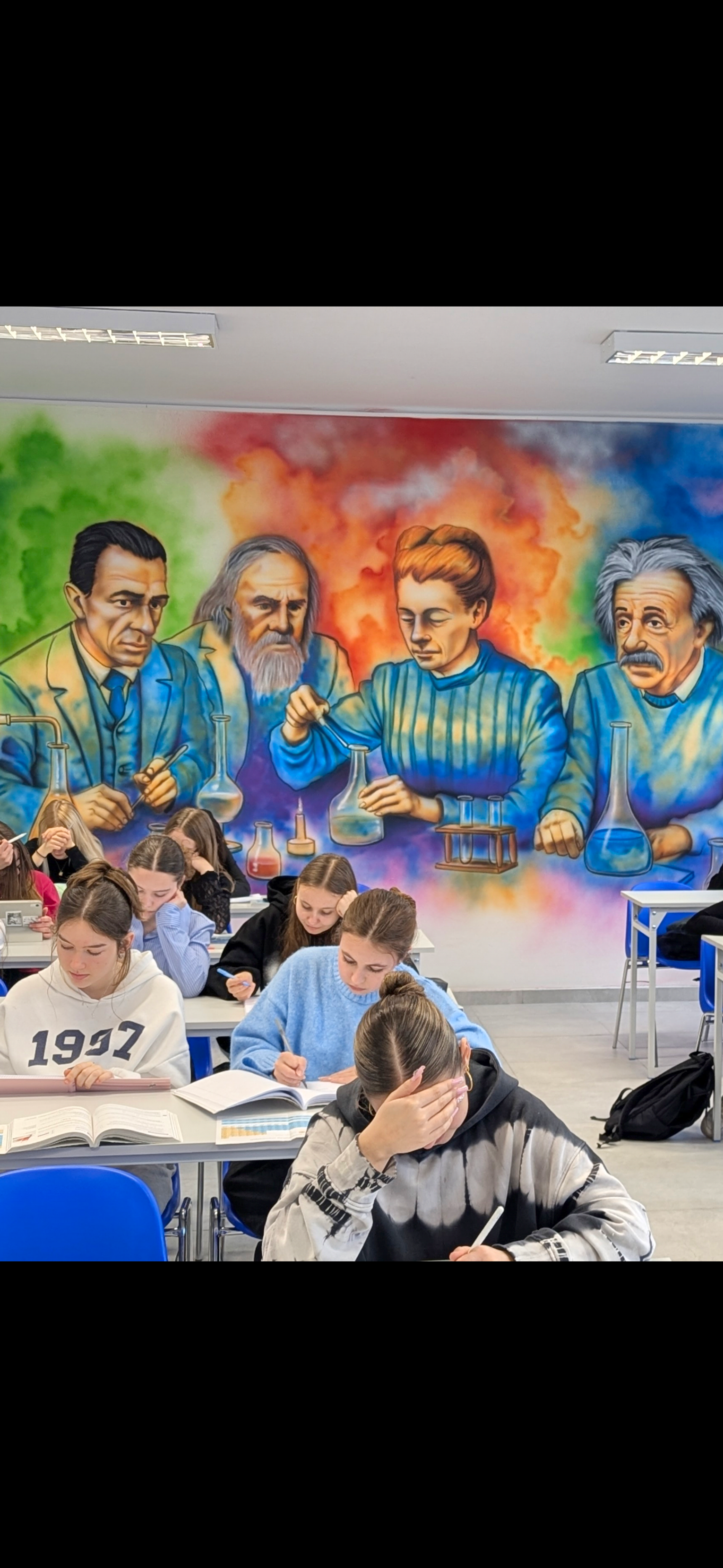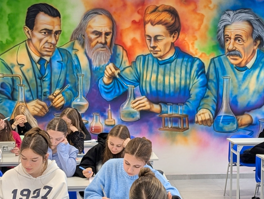 To jednak nie koniec artystycznych zmian w II LO. Równolegle trwał remont pracowni chemicznej, który stał się okazją do kolejnej wizualnej metamorfozy. Na jednej ze ścian pojawiła się wielkoformatowa praca malarska przedstawiająca wybitnych uczonych.