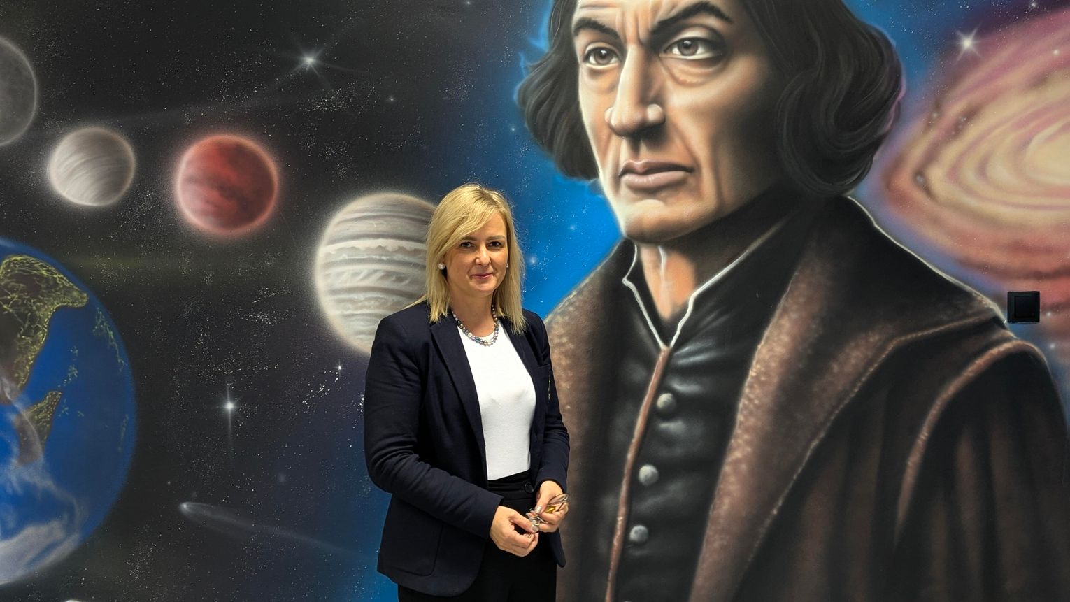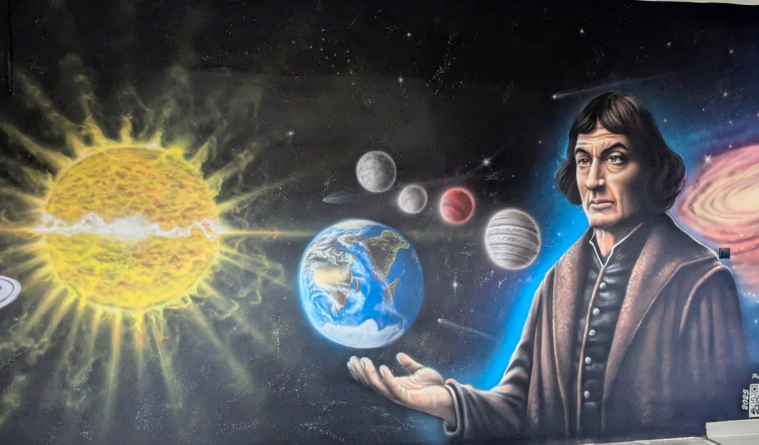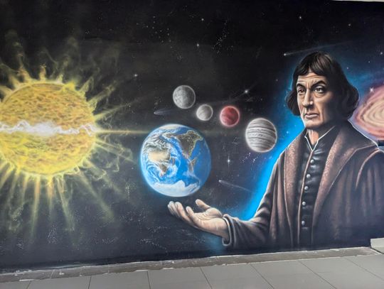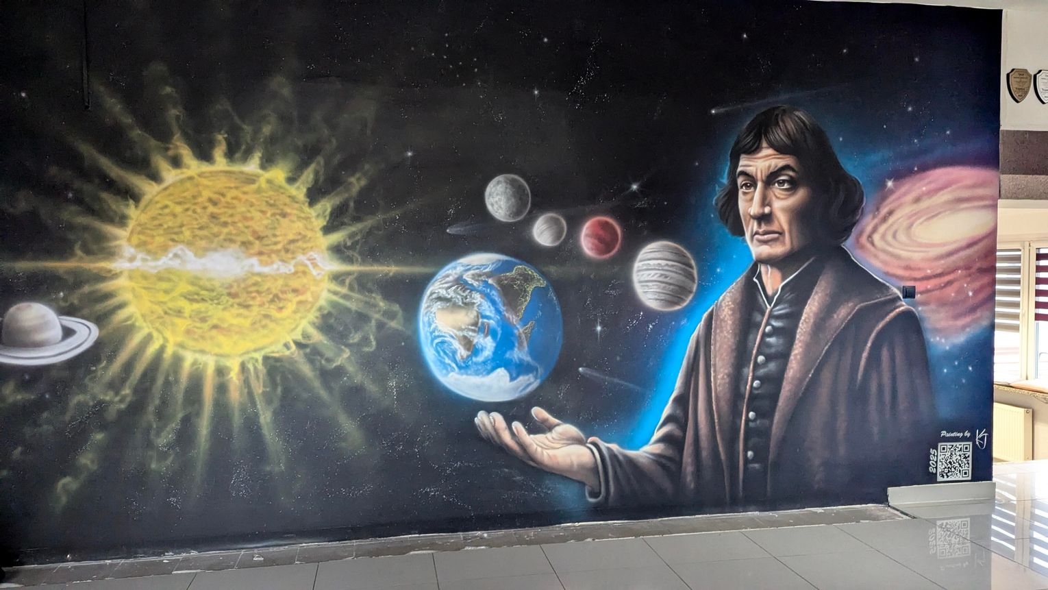Nowy mural to nie tylko element dekoracyjny, ale wyraźny symbol tożsamości szkoły. Monumentalny wizerunek astronoma dominuje w holu i od pierwszego spojrzenia buduje klimat miejsca, które chce być nowoczesne, rozpoznawalne i dumne ze swojego patrona.
