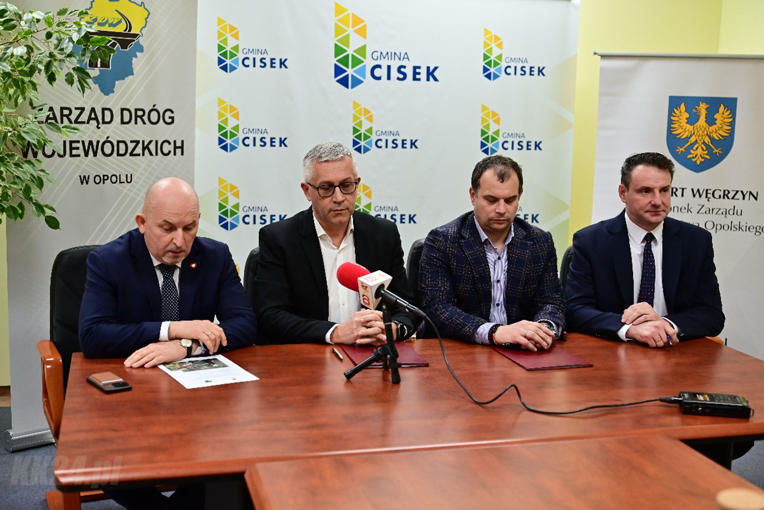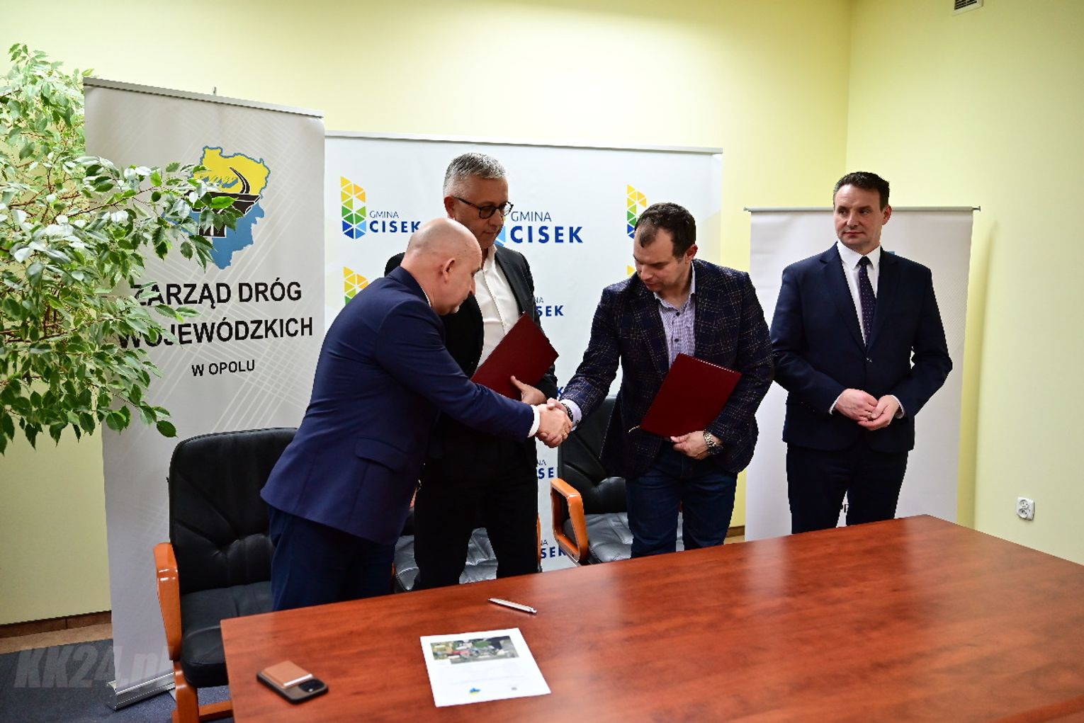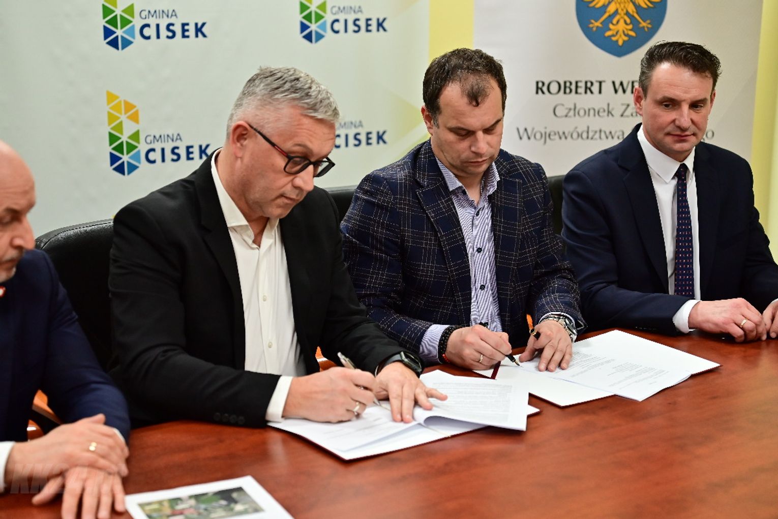Umowa została zawarta w obecności Członka Zarządu Województwa Opolskiego Roberta Węgrzyna oraz wójta gminy Cisek Rajmunda Frischko. Dokument podpisali dyrektor Zarządu Dróg Wojewódzkich w Opolu ds. inwestycji Mirosław Sokołowski oraz właściciel firmy Arcus 2 - wykonawcy projektu - Tadeusz Hoszowski.