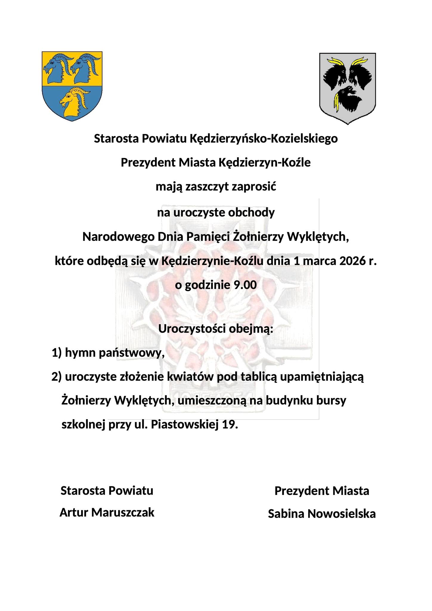 Na uroczystości zapraszają starosta powiatu kędzierzyńsko-kozielskiego Artur Maruszczak oraz prezydent Kędzierzyn-Koźle Sabina Nowosielska.