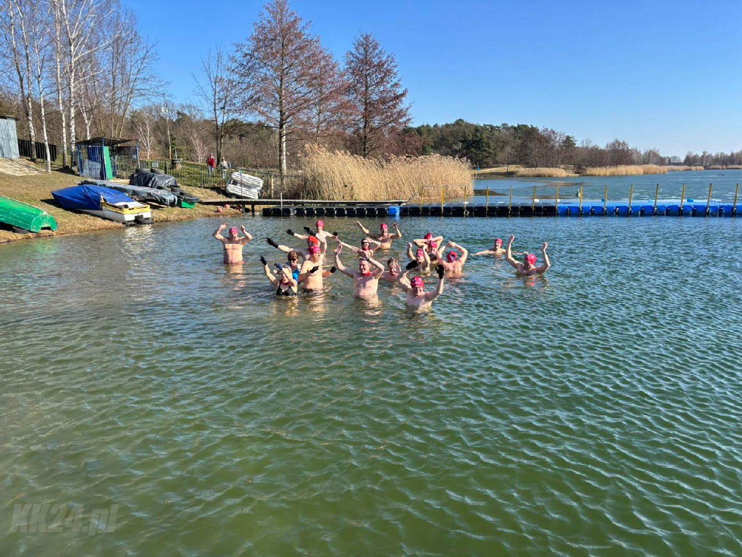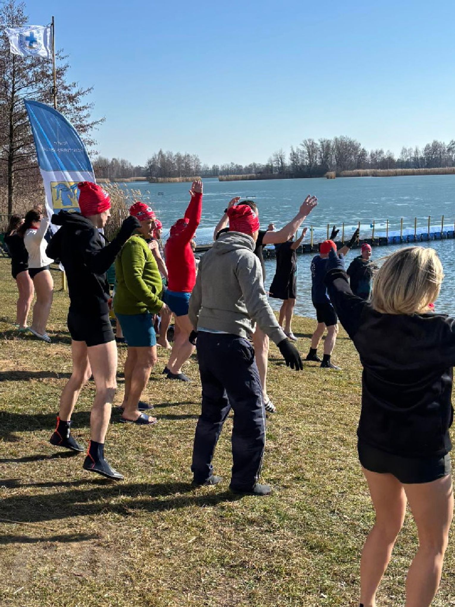 Wydarzenie na Dębowej rozpoczęło się od energicznej rozgrzewki, która skutecznie przygotowała uczestników na najważniejszy moment spotkania. Po kilku minutach ćwiczeń przyszedł czas na wspólne zanurzenie w wodach jeziora Dębowa. To właśnie tam lokalni samorządowcy stanęli ramię w ramię, udowadniając, że nie brakuje im hartu ducha i dystansu do siebie.