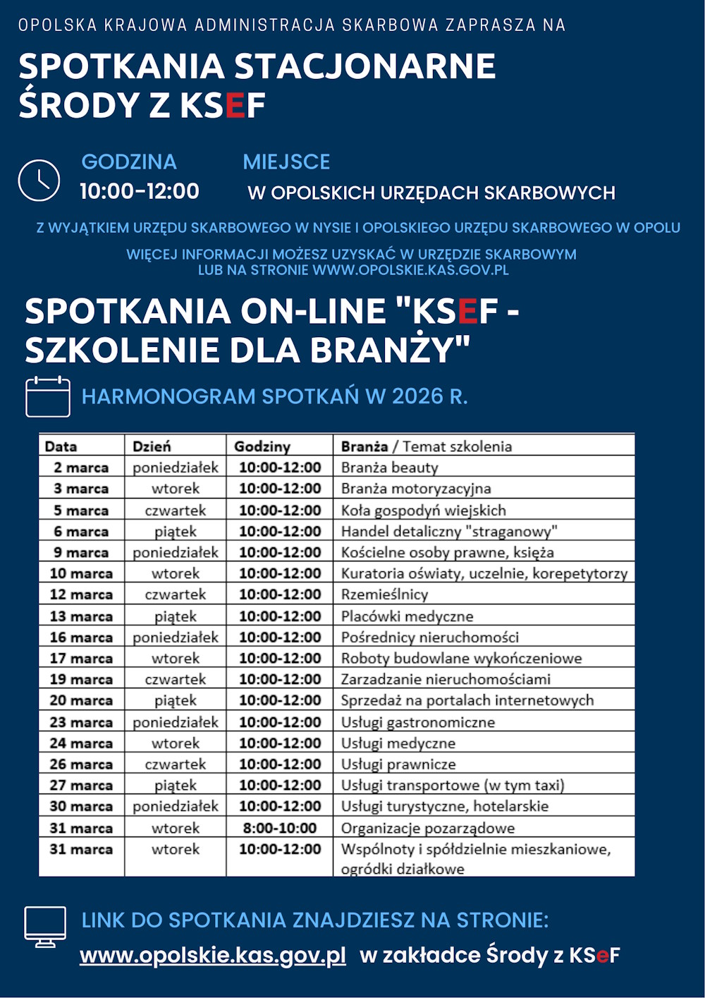 Dokładny harmonogram spotkań, daty oraz godziny szkoleń stacjonarnych i online prowadzonych przez opolską KAS poniżej: