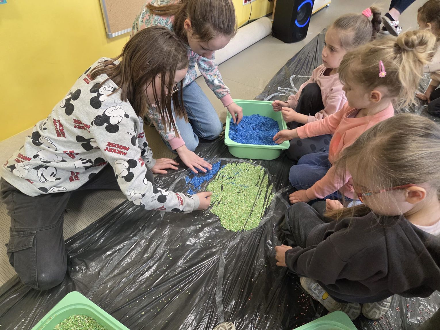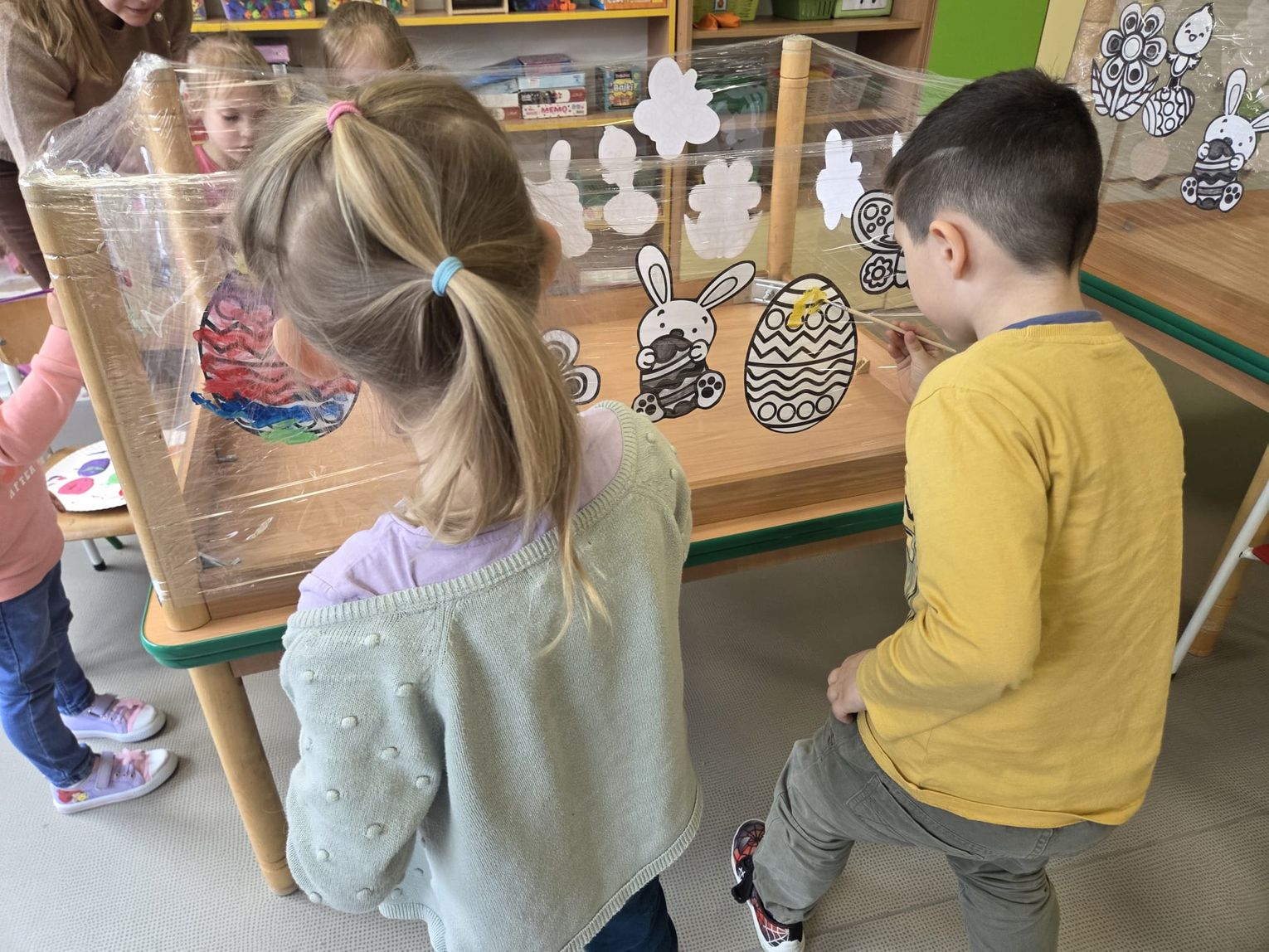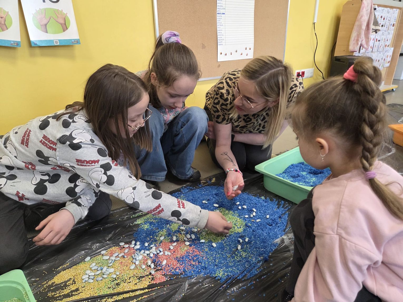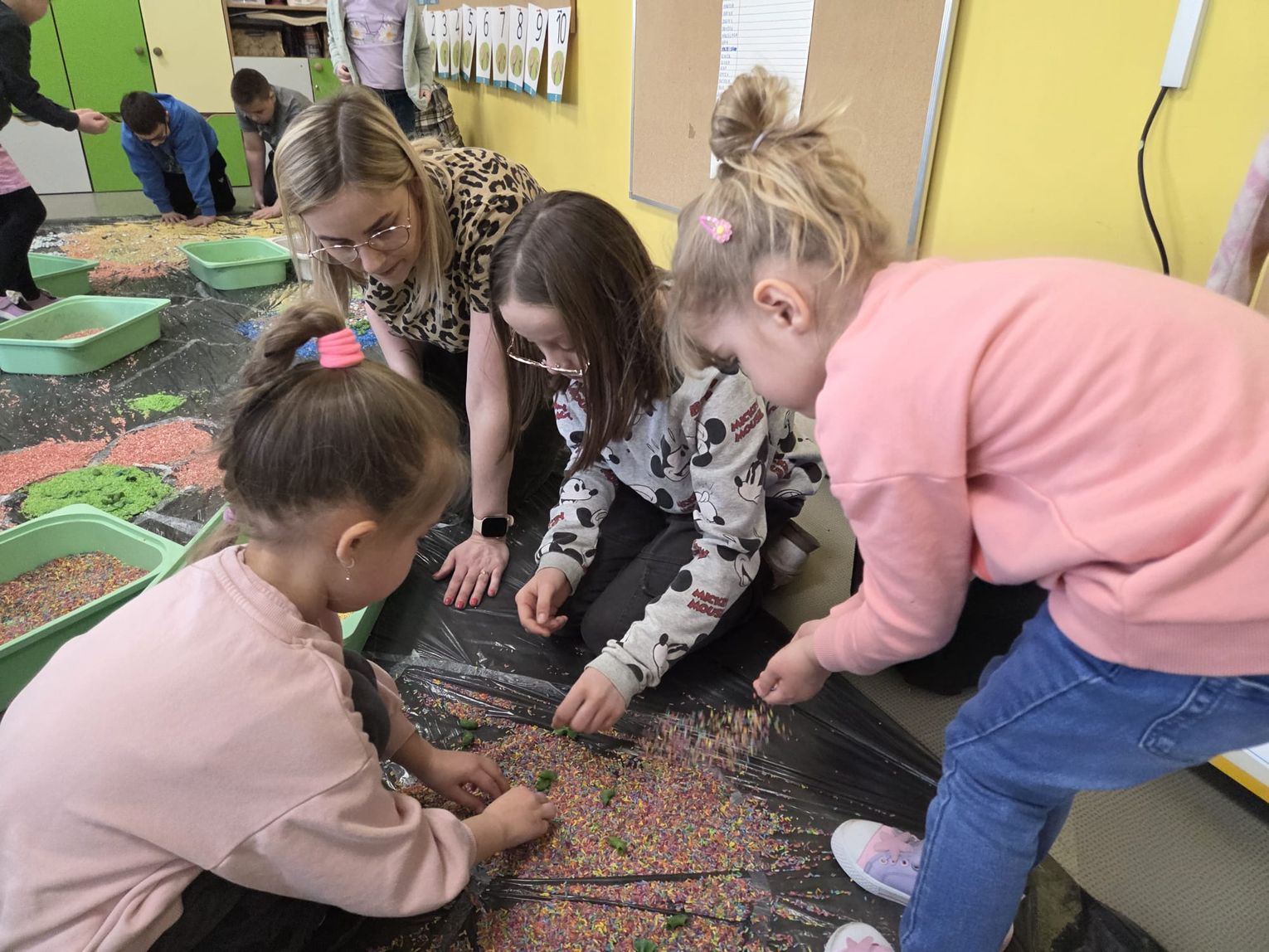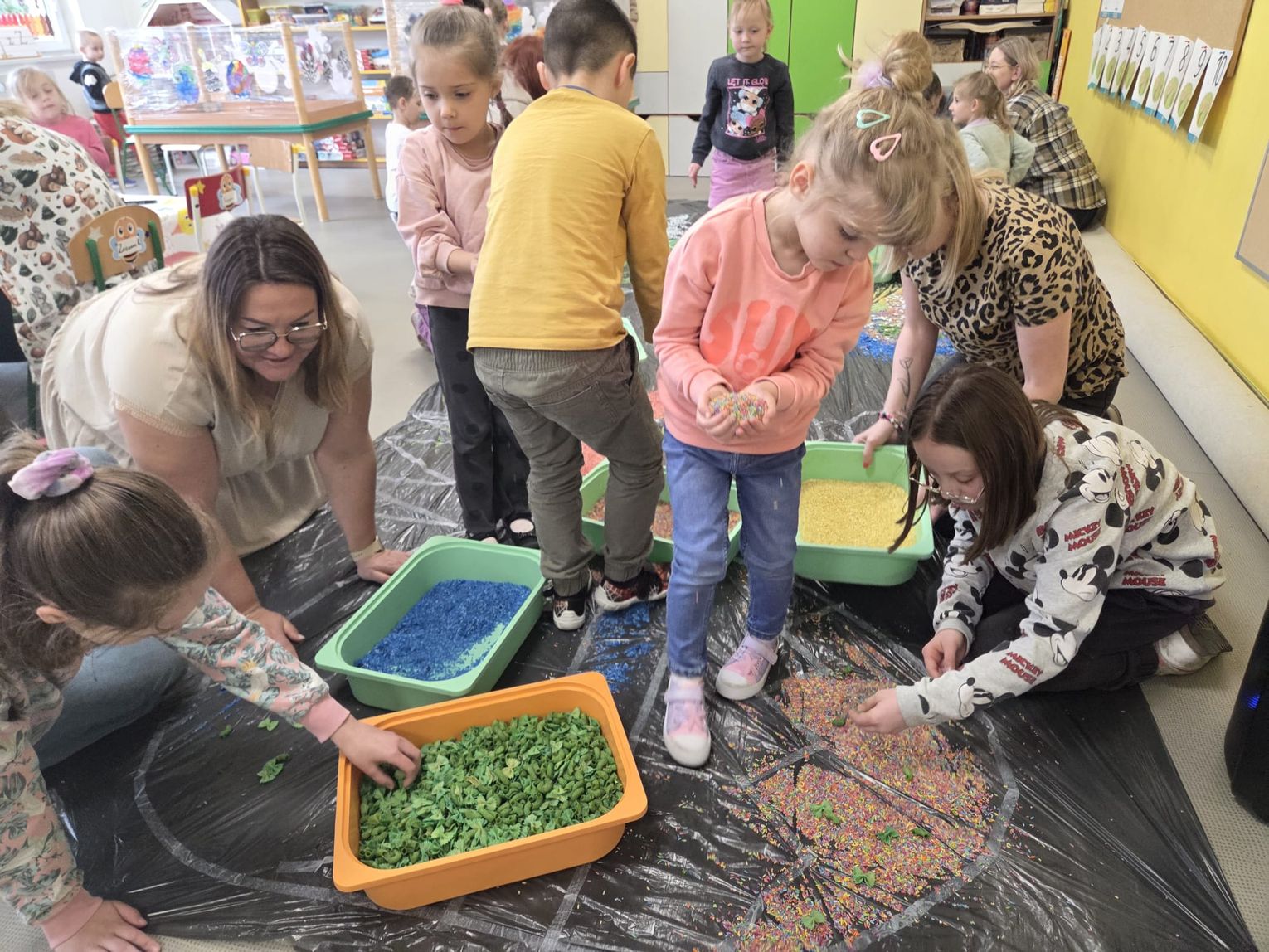 Nie zabrakło również kreatywnych zajęć plastycznych. Malowanie na folii stało się okazją do tworzenia kolorowych prac inspirowanych wiosną i zbliżającymi się świętami wielkanocnymi. Dużym zainteresowaniem cieszyła się także sensoplastyka – zabawy z wykorzystaniem ryżu, makaronu czy kaszy, z których powstały efektowne pisanki i wiosenne dekoracje.