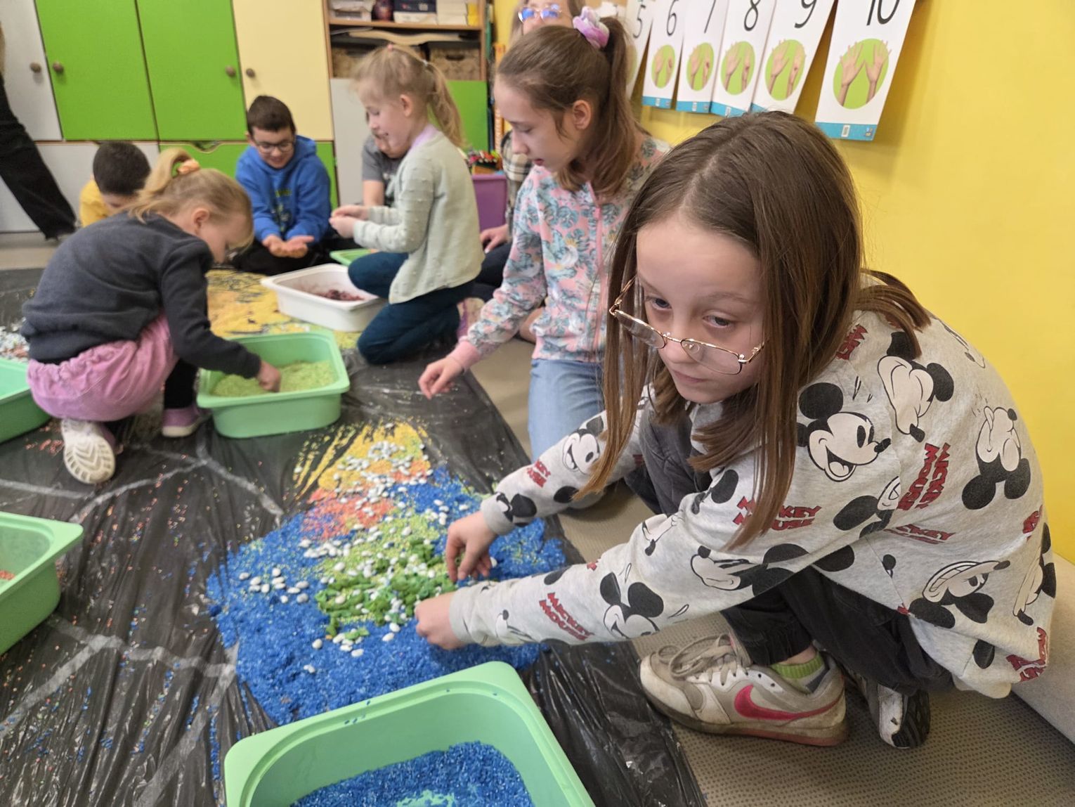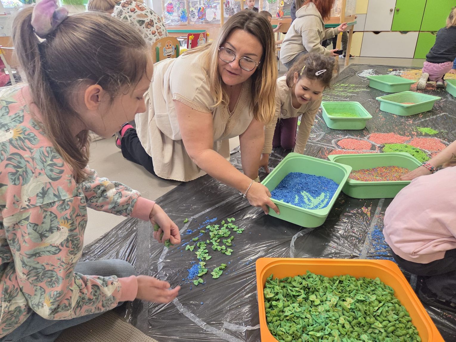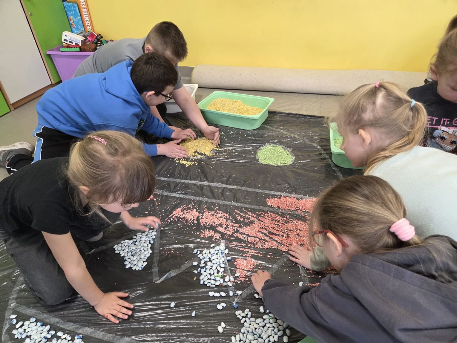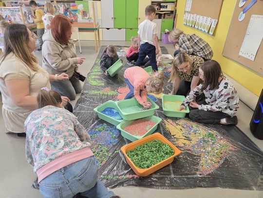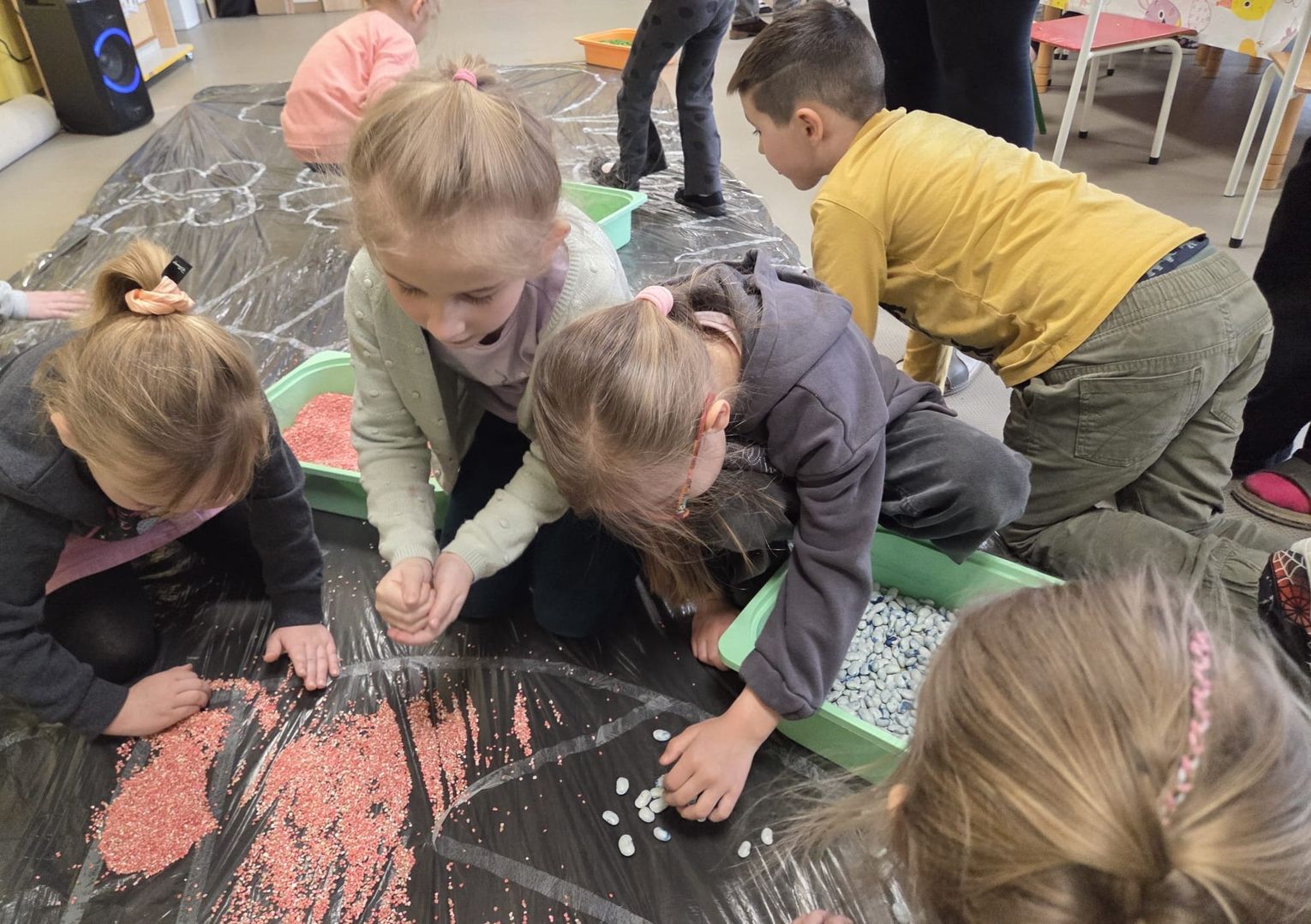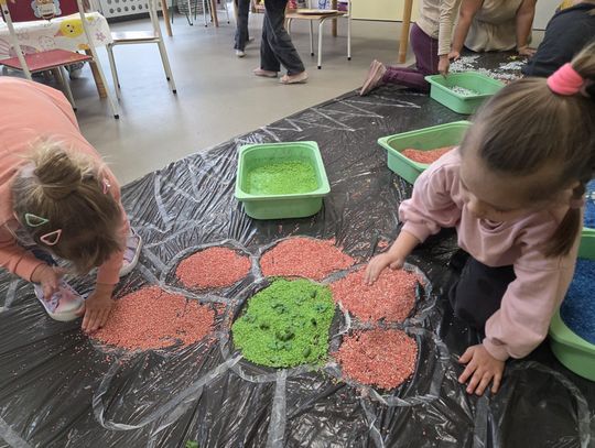 Nie zabrakło również kreatywnych zajęć plastycznych. Malowanie na folii stało się okazją do tworzenia kolorowych prac inspirowanych wiosną i zbliżającymi się świętami wielkanocnymi. Dużym zainteresowaniem cieszyła się także sensoplastyka – zabawy z wykorzystaniem ryżu, makaronu czy kaszy, z których powstały efektowne pisanki i wiosenne dekoracje.