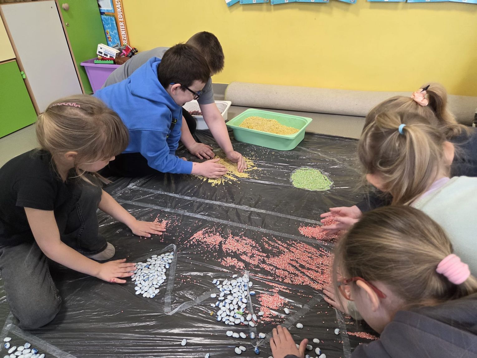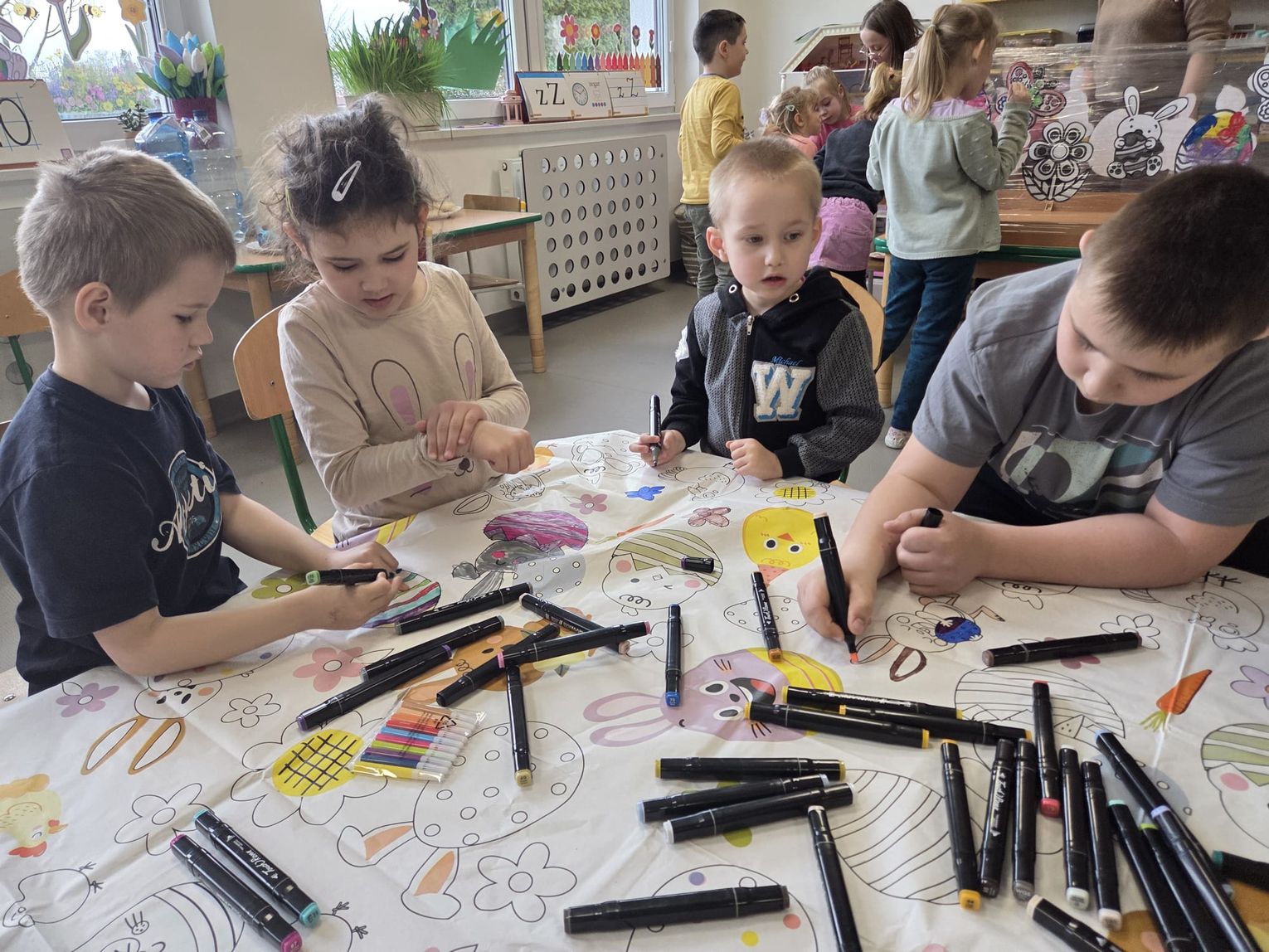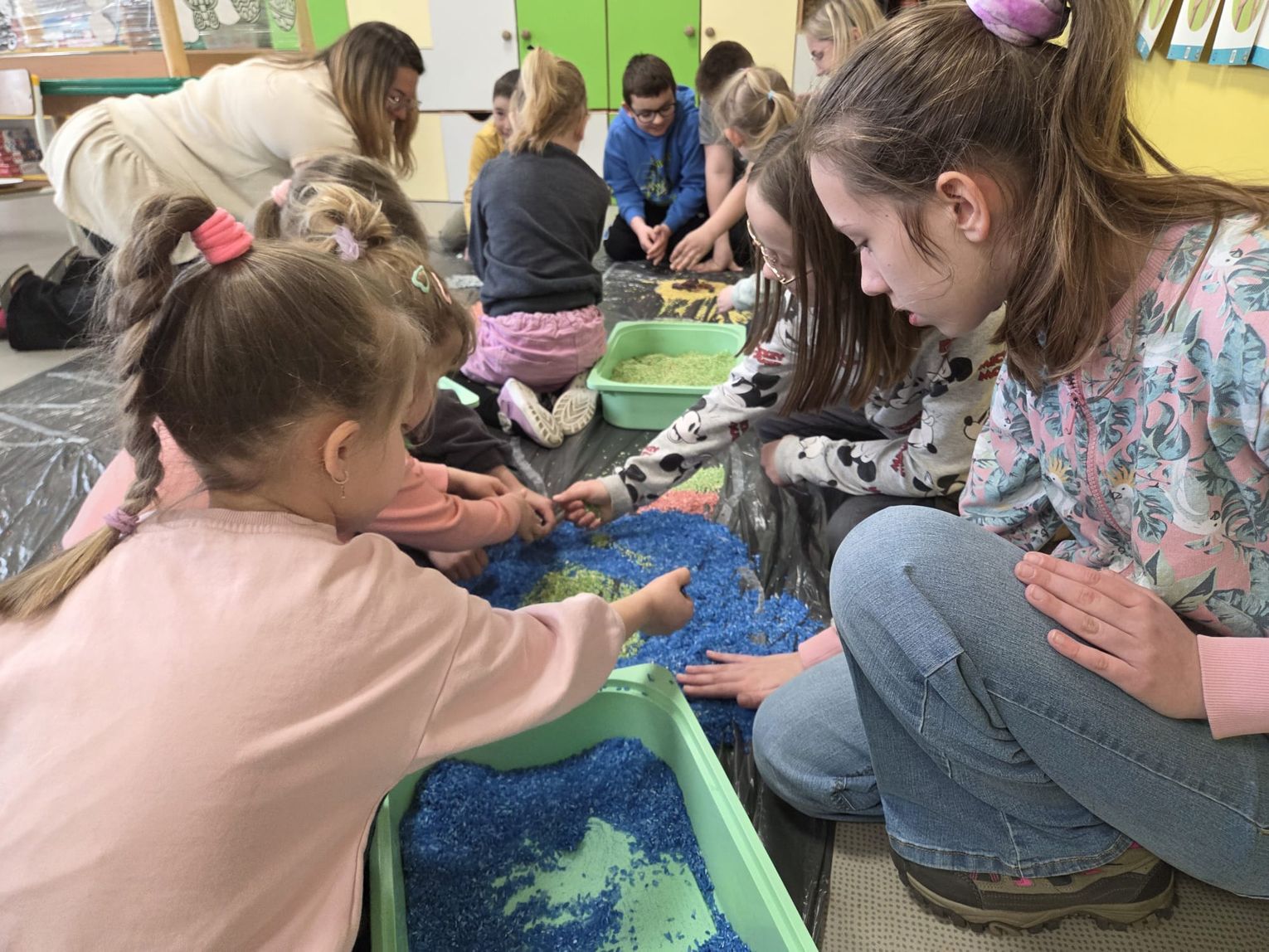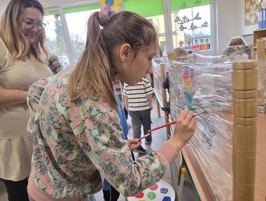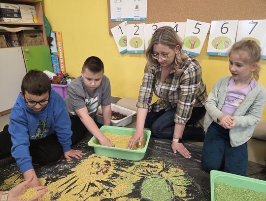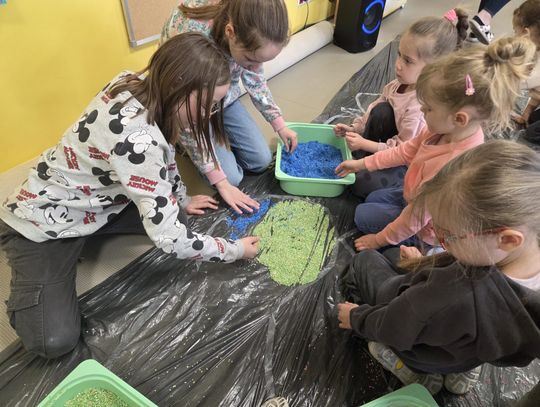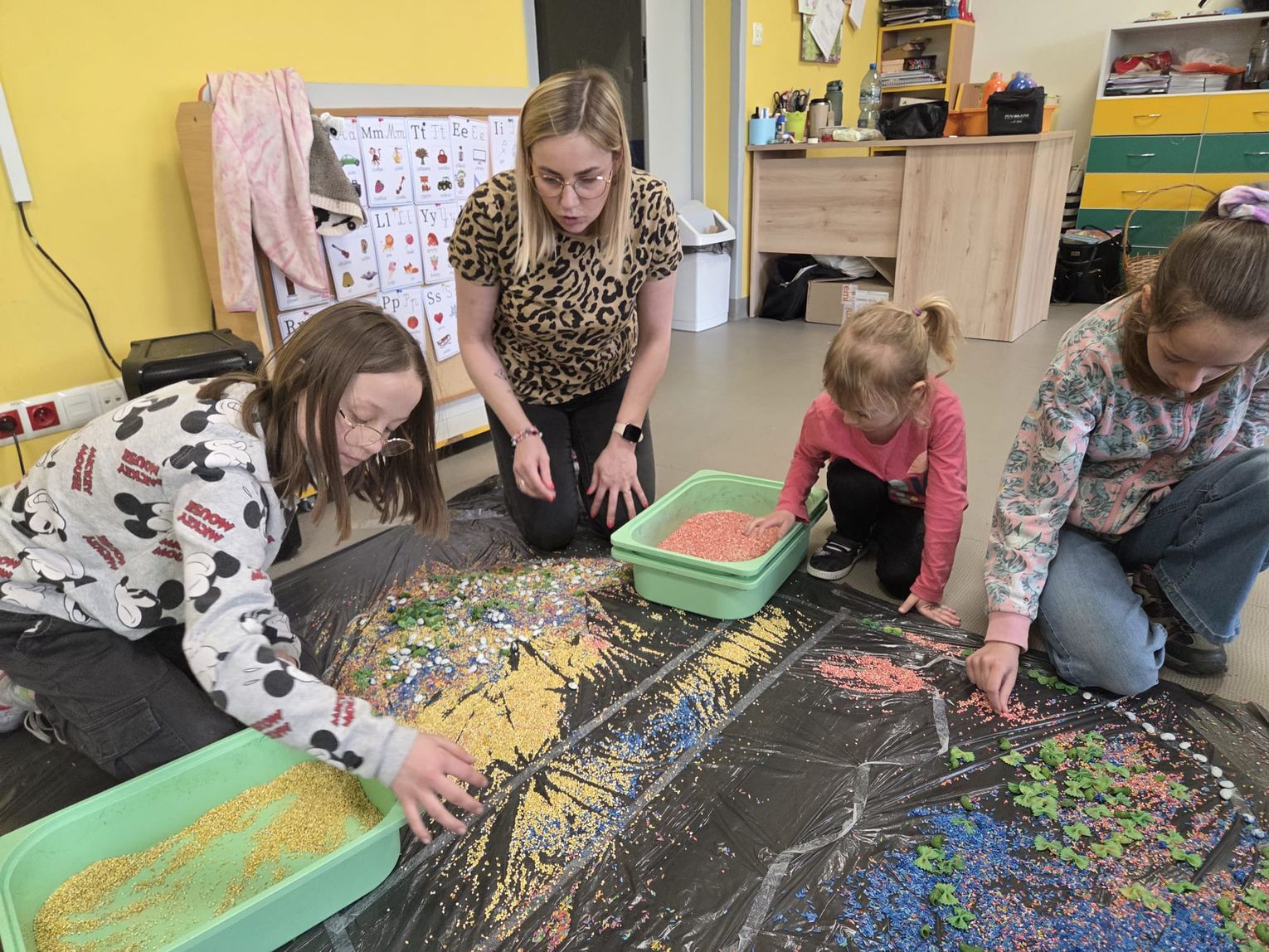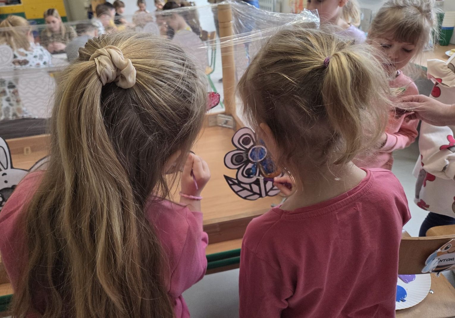Nie zabrakło również kreatywnych zajęć plastycznych. Malowanie na folii stało się okazją do tworzenia kolorowych prac inspirowanych wiosną i zbliżającymi się świętami wielkanocnymi. Dużym zainteresowaniem cieszyła się także sensoplastyka – zabawy z wykorzystaniem ryżu, makaronu czy kaszy, z których powstały efektowne pisanki i wiosenne dekoracje.