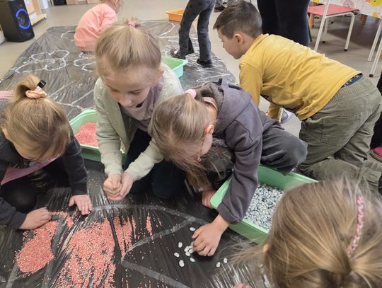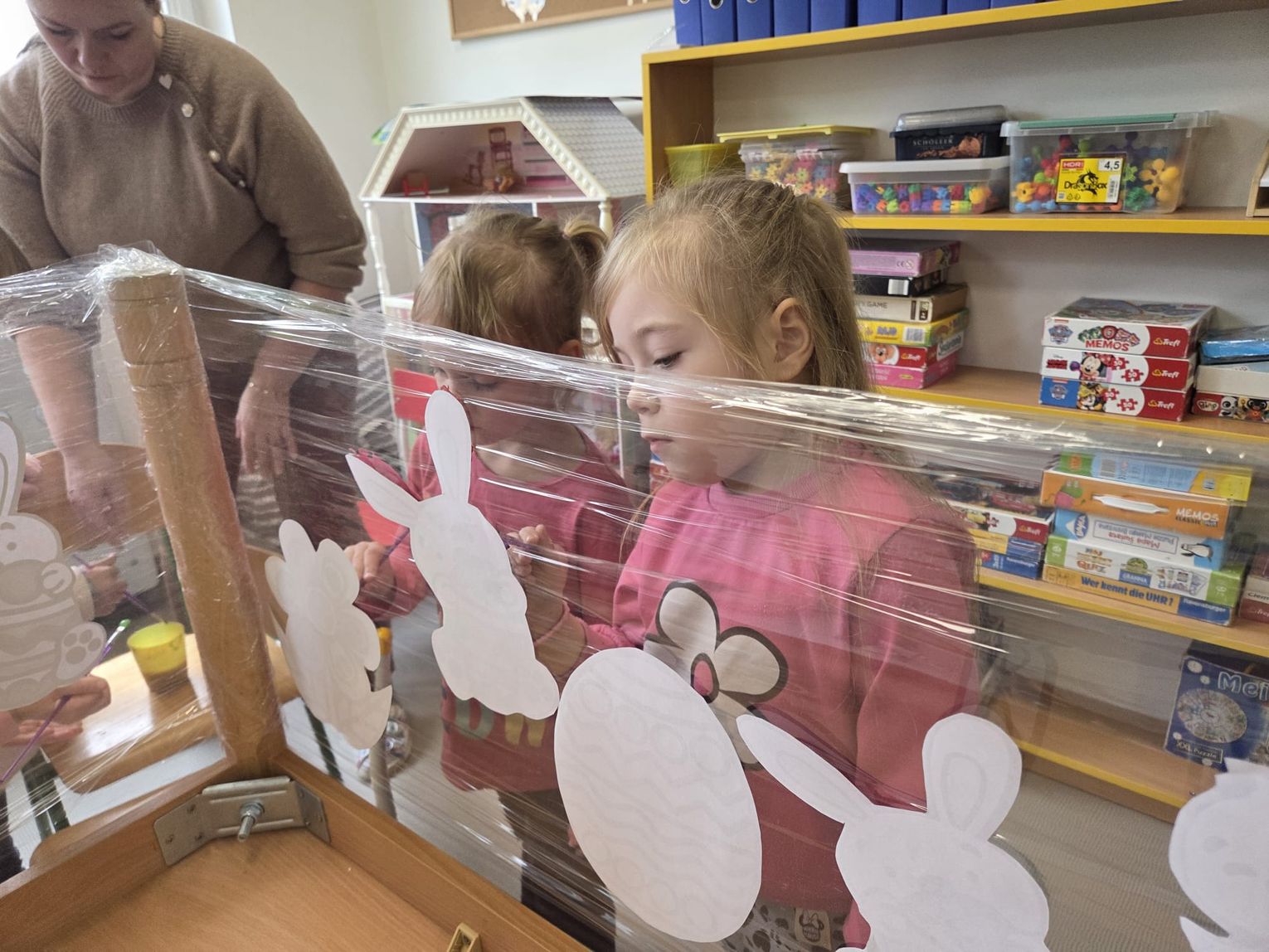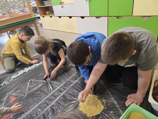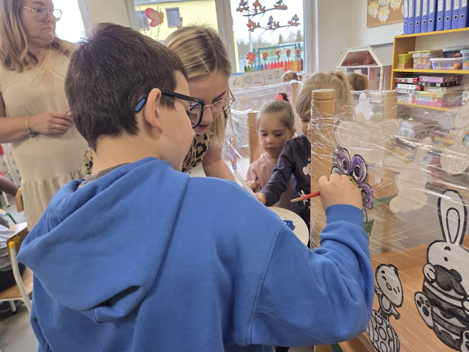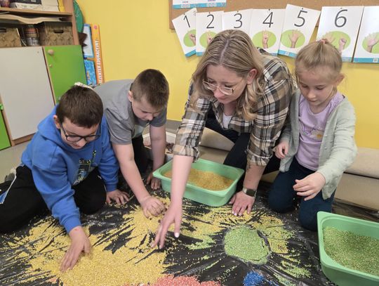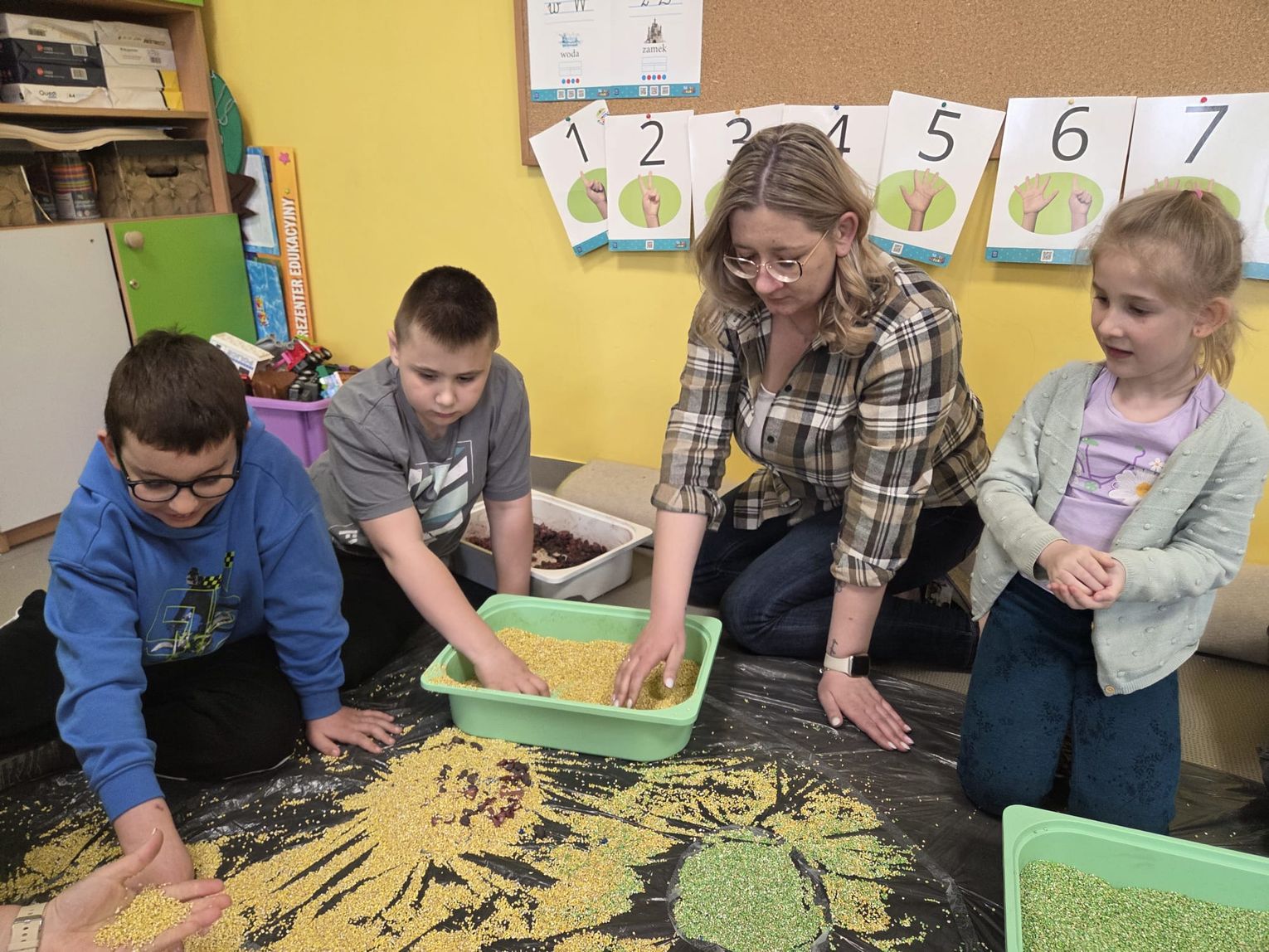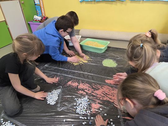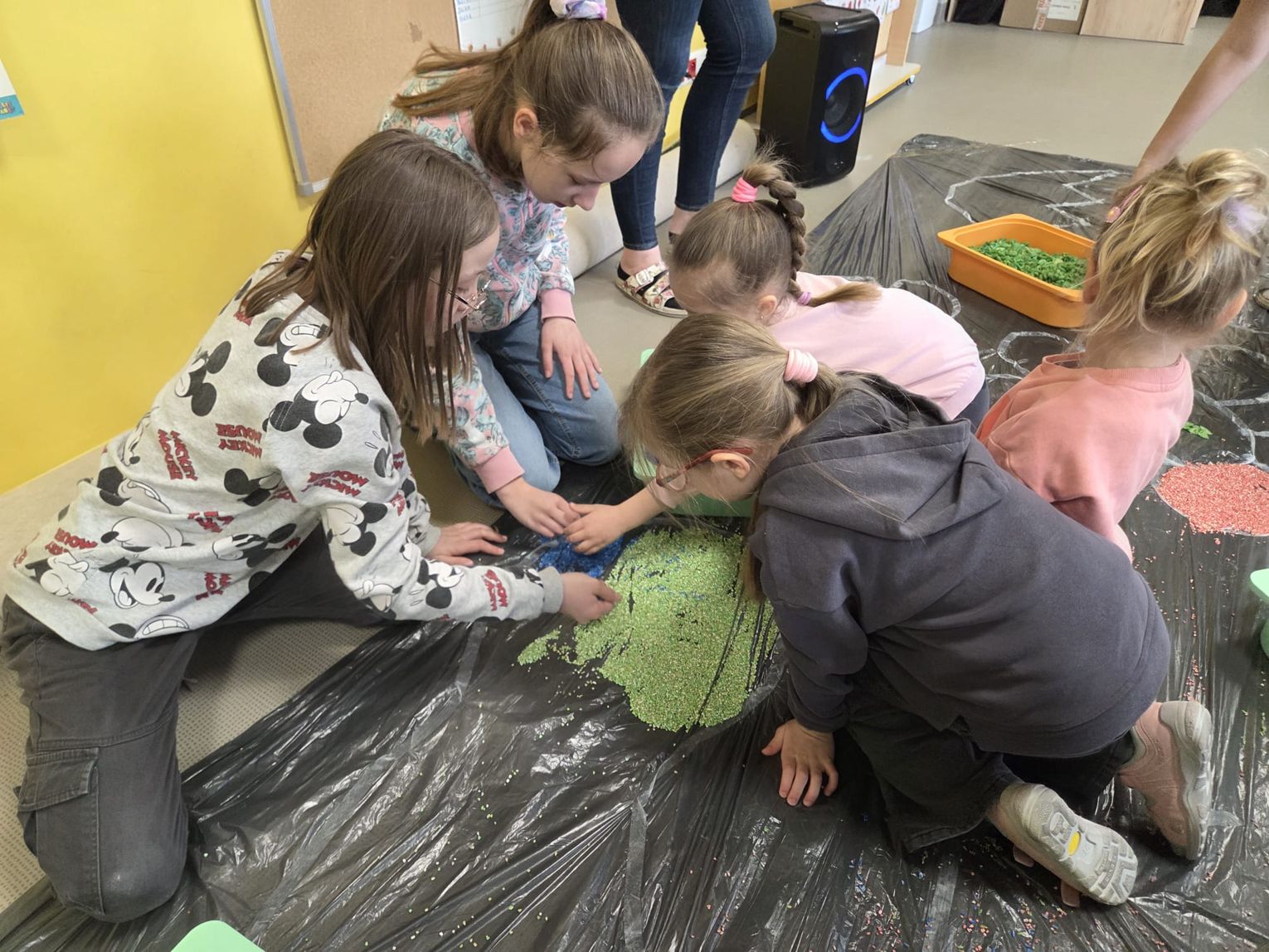 Nie zabrakło również kreatywnych zajęć plastycznych. Malowanie na folii stało się okazją do tworzenia kolorowych prac inspirowanych wiosną i zbliżającymi się świętami wielkanocnymi. Dużym zainteresowaniem cieszyła się także sensoplastyka – zabawy z wykorzystaniem ryżu, makaronu czy kaszy, z których powstały efektowne pisanki i wiosenne dekoracje.
