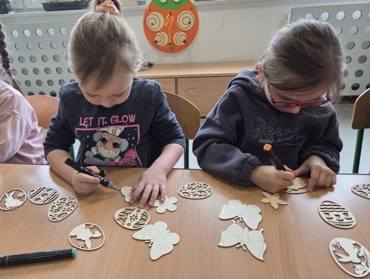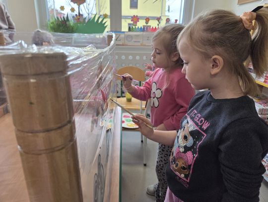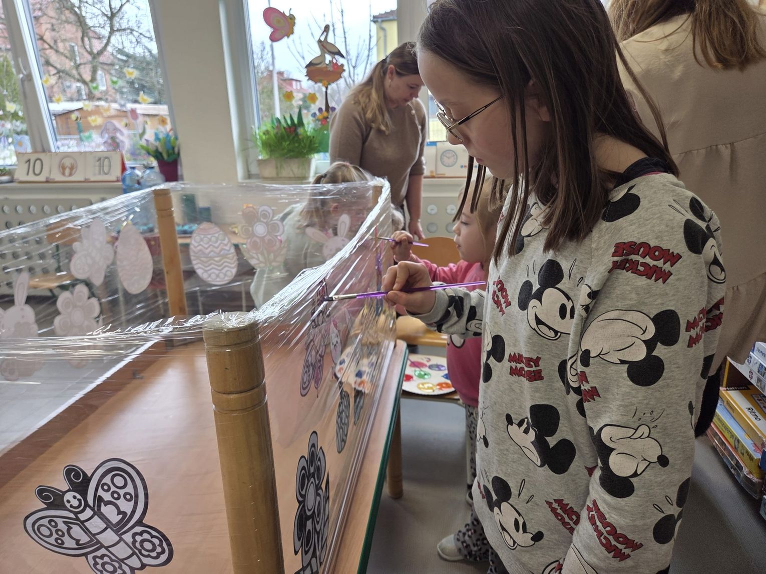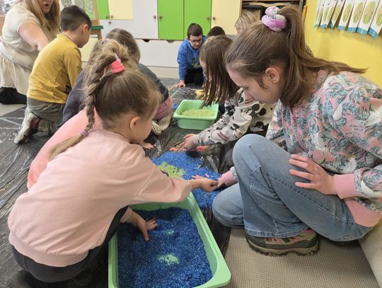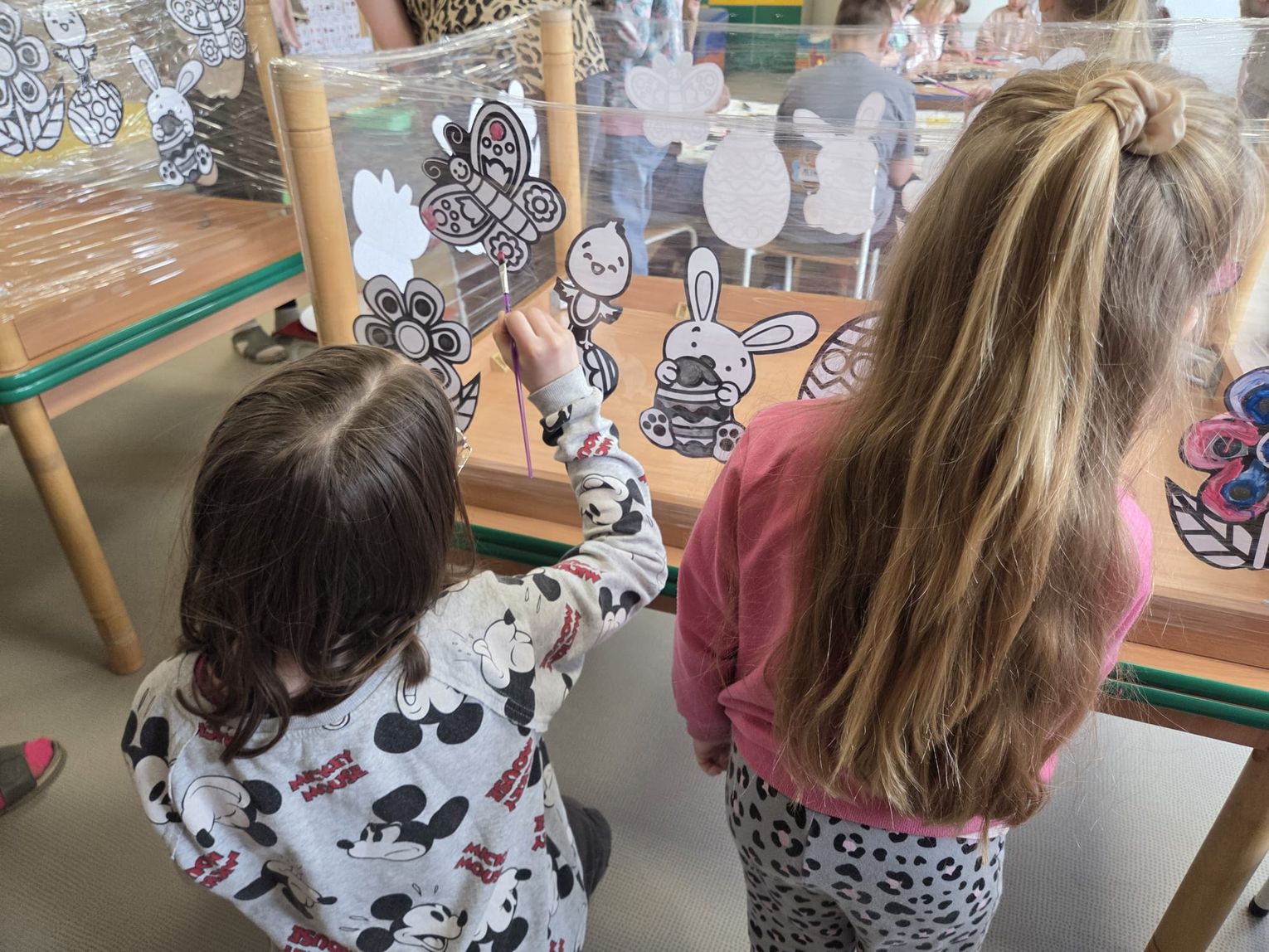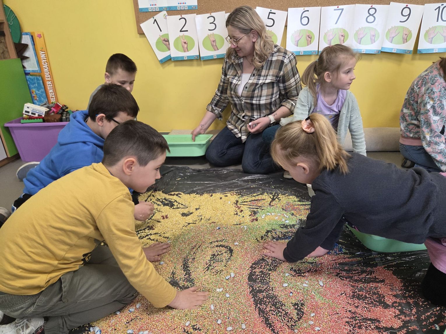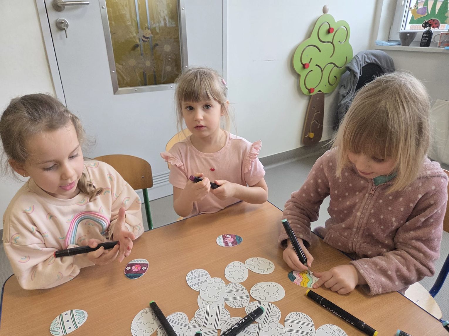 Nie zabrakło również kreatywnych zajęć plastycznych. Malowanie na folii stało się okazją do tworzenia kolorowych prac inspirowanych wiosną i zbliżającymi się świętami wielkanocnymi. Dużym zainteresowaniem cieszyła się także sensoplastyka – zabawy z wykorzystaniem ryżu, makaronu czy kaszy, z których powstały efektowne pisanki i wiosenne dekoracje.
