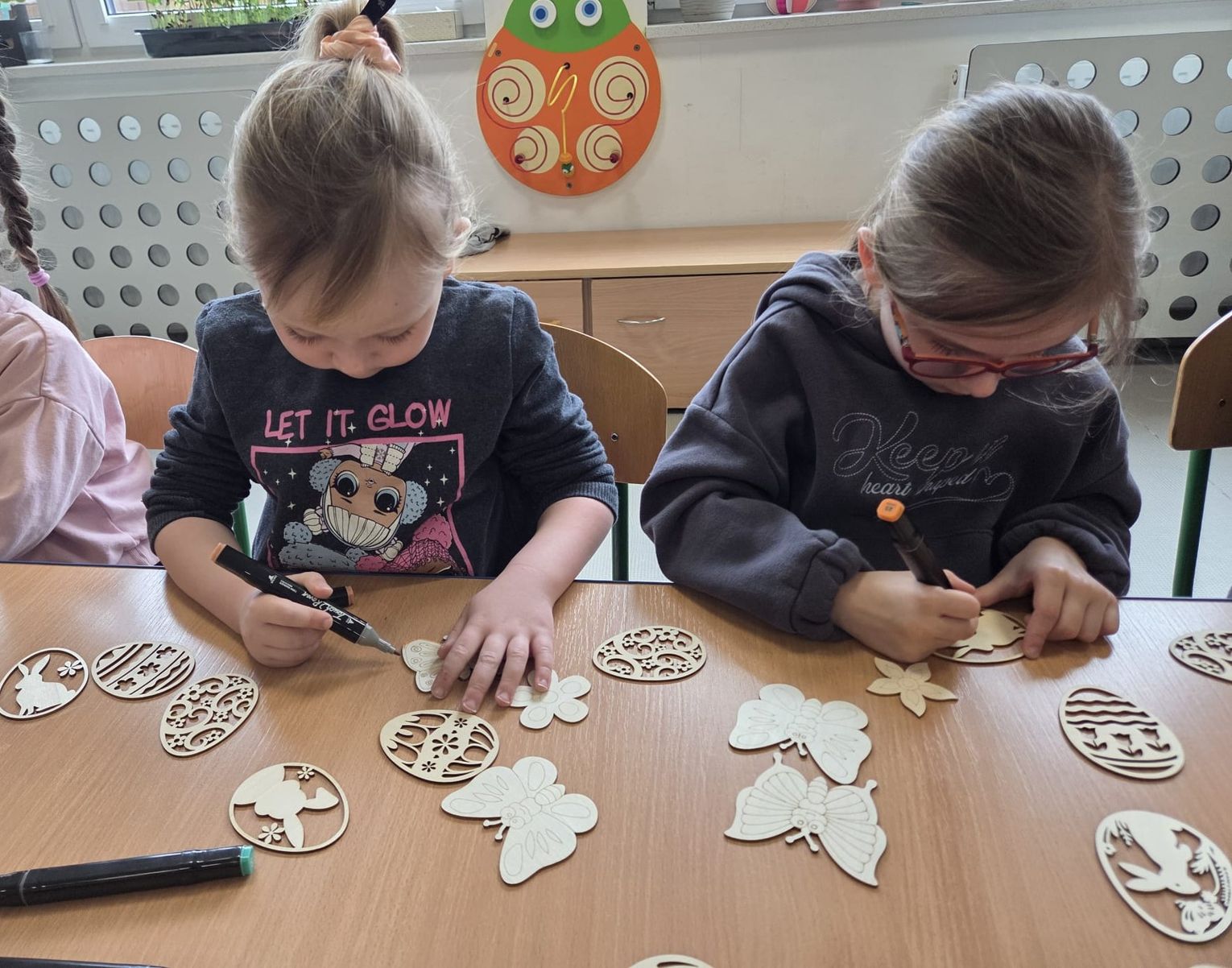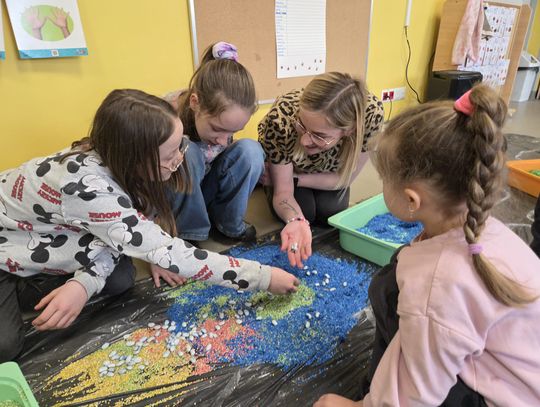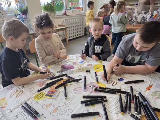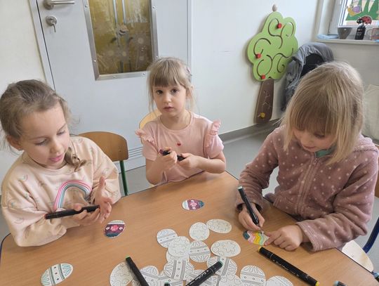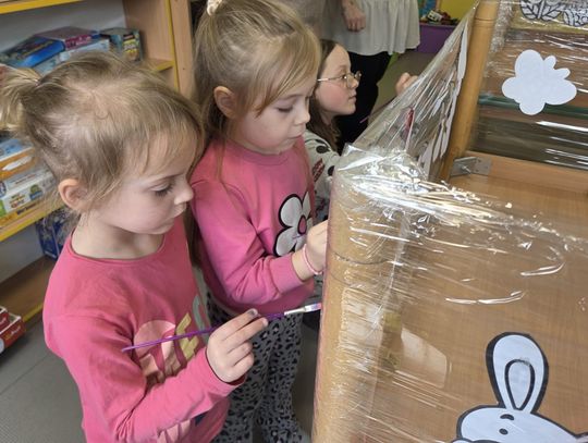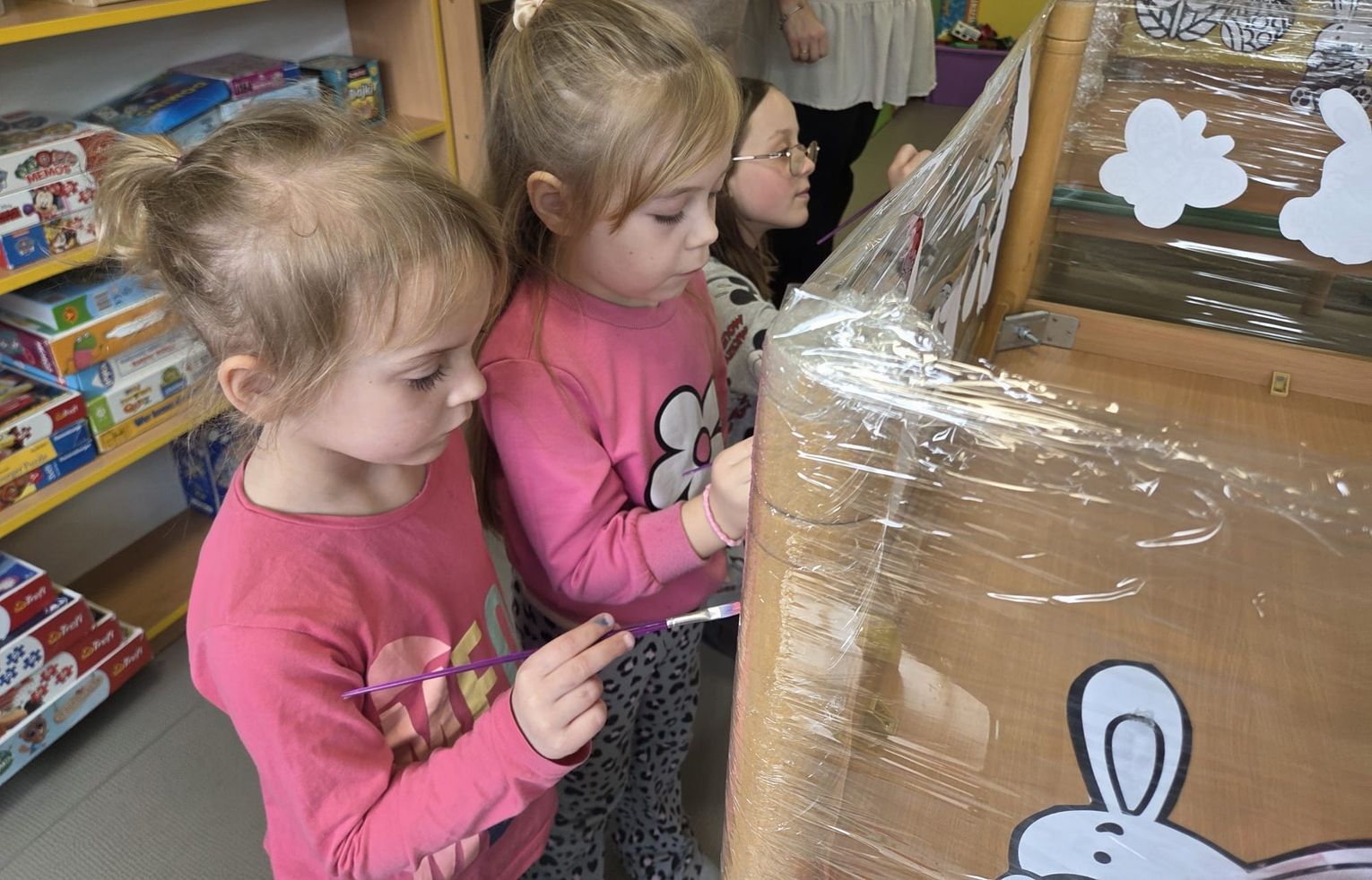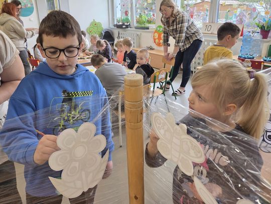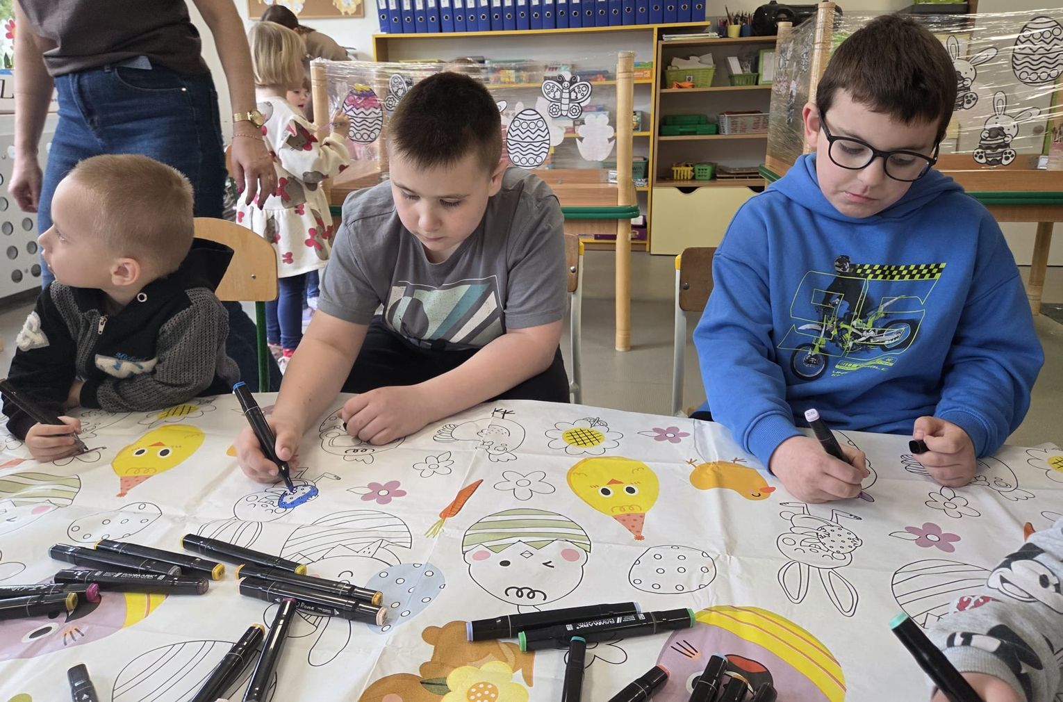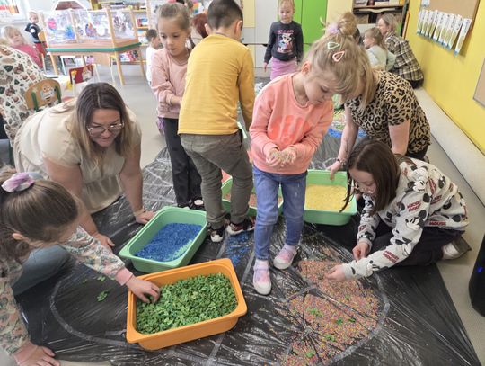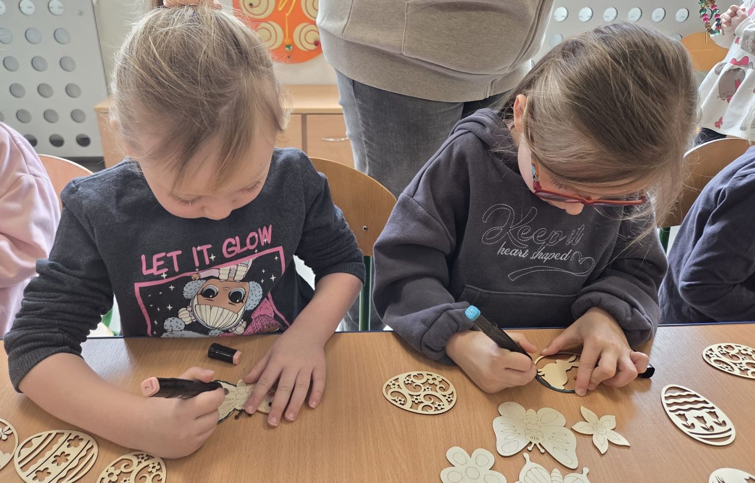 Nie zabrakło również kreatywnych zajęć plastycznych. Malowanie na folii stało się okazją do tworzenia kolorowych prac inspirowanych wiosną i zbliżającymi się świętami wielkanocnymi. Dużym zainteresowaniem cieszyła się także sensoplastyka – zabawy z wykorzystaniem ryżu, makaronu czy kaszy, z których powstały efektowne pisanki i wiosenne dekoracje.