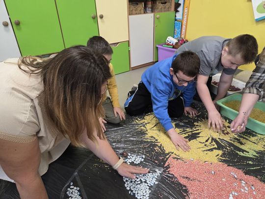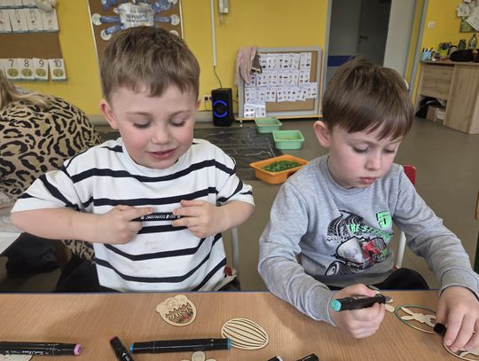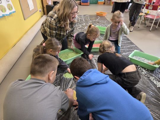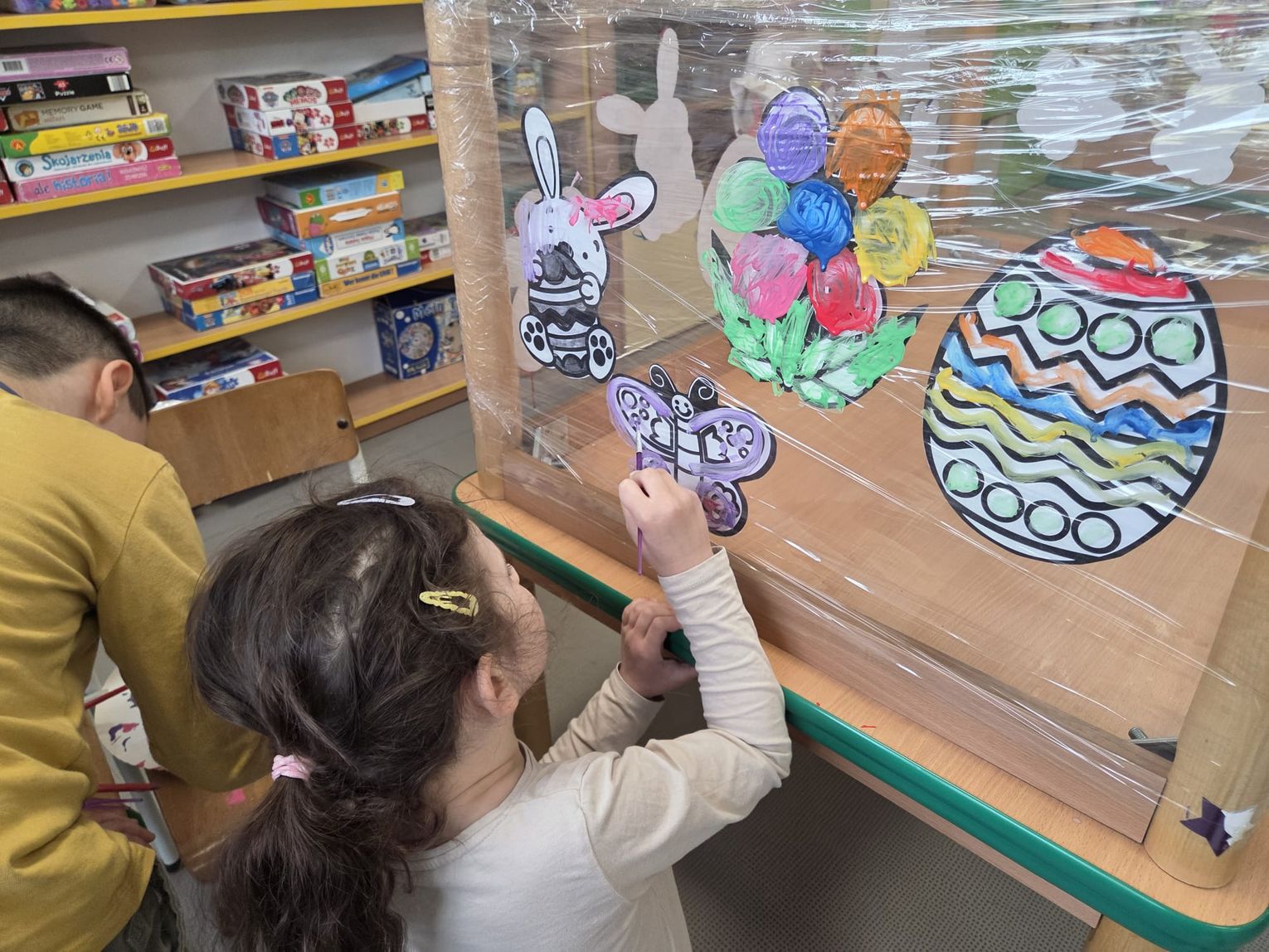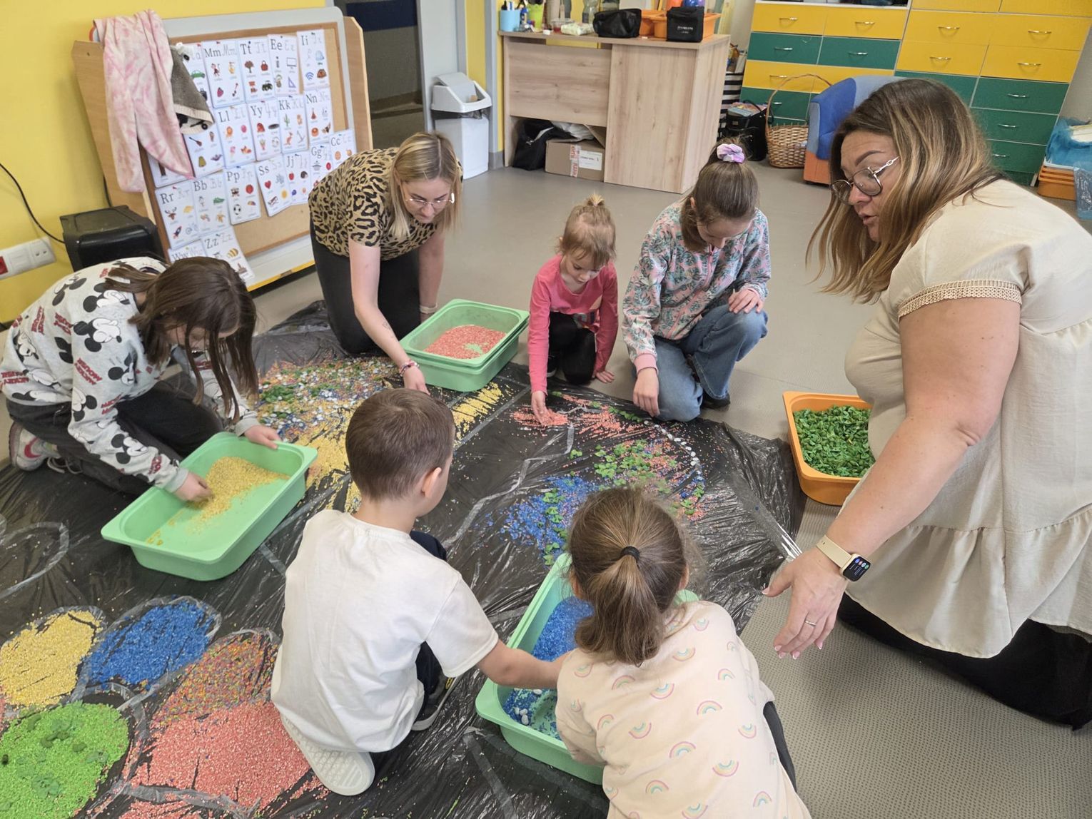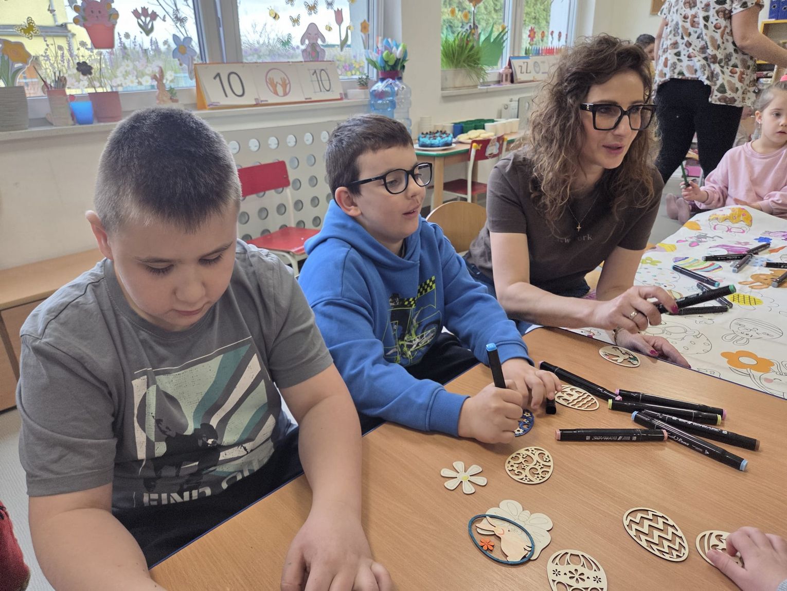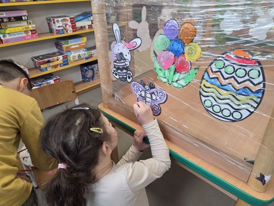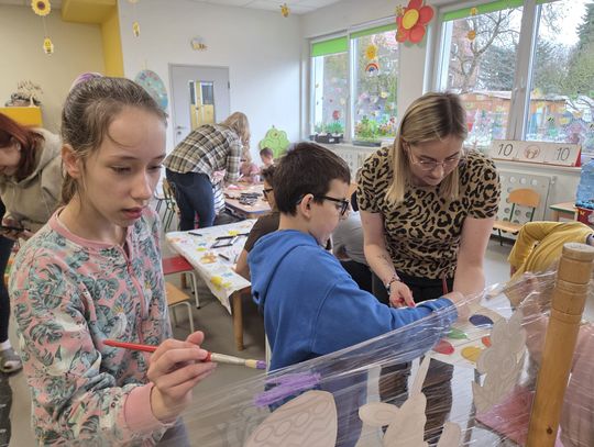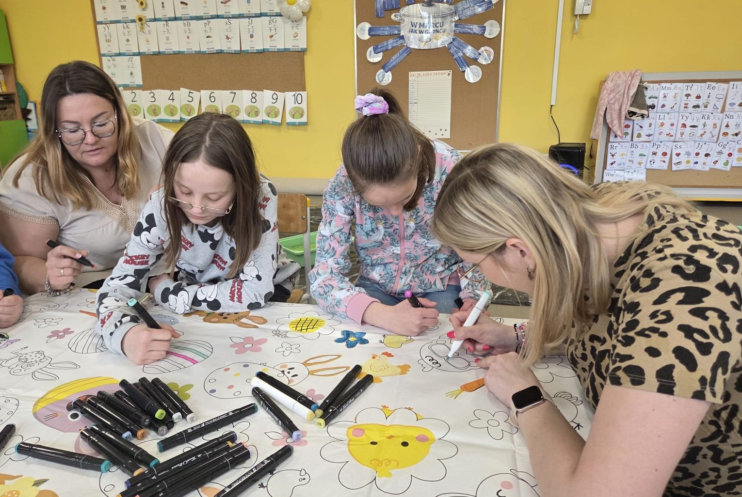 Nie zabrakło również kreatywnych zajęć plastycznych. Malowanie na folii stało się okazją do tworzenia kolorowych prac inspirowanych wiosną i zbliżającymi się świętami wielkanocnymi. Dużym zainteresowaniem cieszyła się także sensoplastyka – zabawy z wykorzystaniem ryżu, makaronu czy kaszy, z których powstały efektowne pisanki i wiosenne dekoracje.