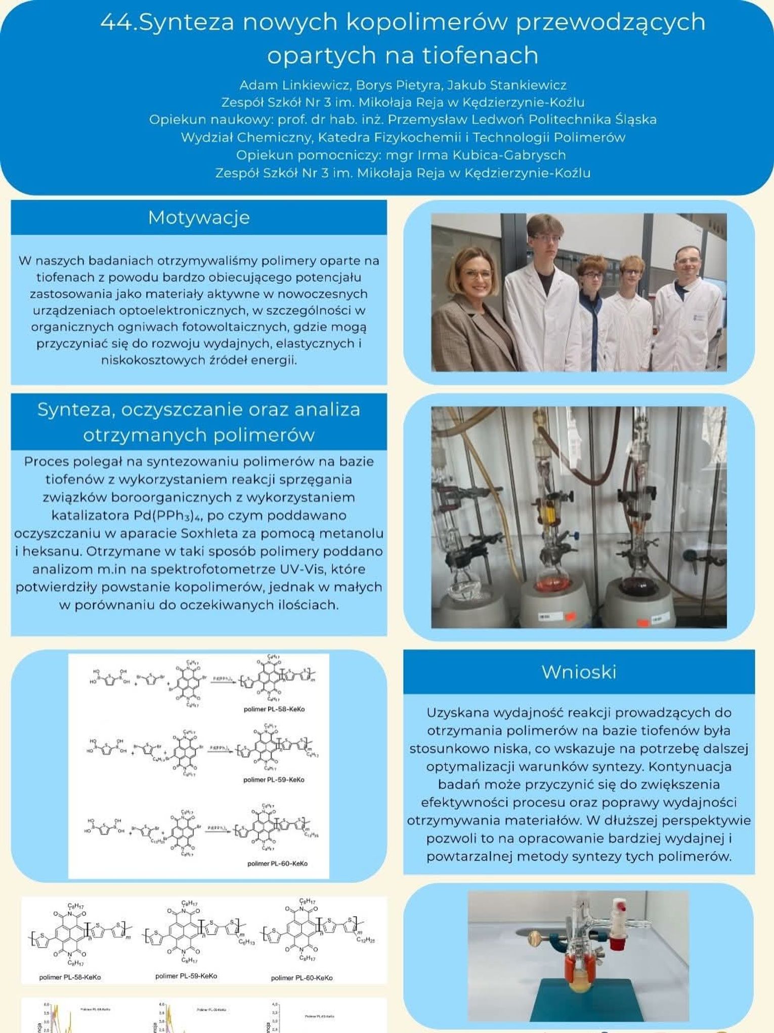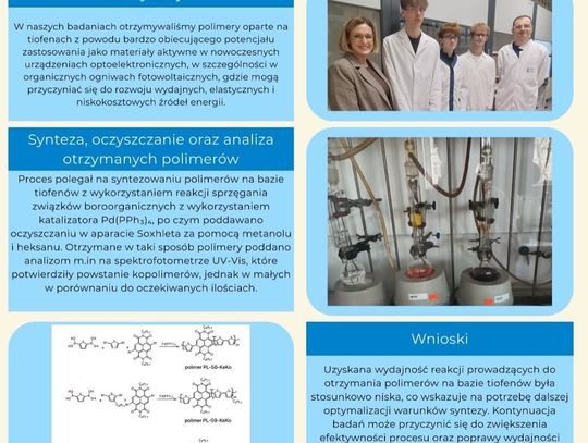 Tematem ich pracy była synteza nowych kopolimerów przewodzących opartych na tiofenach. To zagadnienie, które na co dzień pojawia się raczej w środowisku akademickim niż w szkolnych pracowniach. Mimo to uczniowie z powodzeniem podjęli wyzwanie i przez kilka miesięcy pracowali nad nowoczesnymi materiałami przyszłości.
