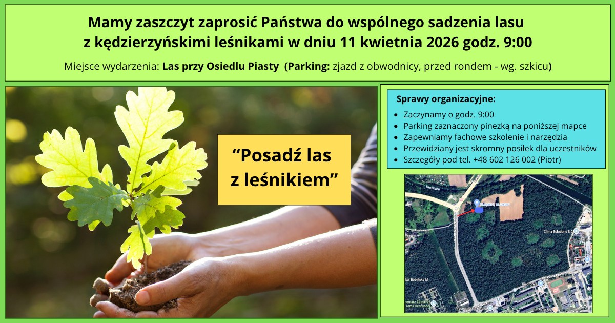 Akcja odbędzie się w sobotę, 11 kwietnia, na terenie Leśnictwa Brzeźce - las przy obwodnicy na osiedlu Piastów. Start zaplanowano na godzinę 9.00, a uczestnicy spotkają się w miejscu wyznaczonym do sadzenia młodych drzew. To właśnie tam każdy będzie mógł spróbować swoich sił w pracy, którą na co dzień wykonują leśnicy.