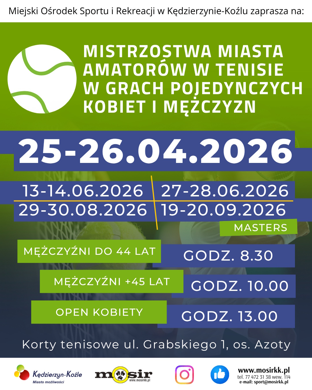 Rozgrywki będą prowadzone w dwóch kategoriach wiekowych dla panów (mężczyźni w wieku 44 lat i młodsi oraz mężczyźni powyżej 45 lat) oraz w kategorii open kobiet. Zaplanowano cztery turnieje, podczas których uczestnicy serii będą zbierać punkty do klasyfikacji końcowej mistrzostw. Zapisy do rozgrywek prowadzone będą przed startem rozgrywek w każdej z kategorii. Szczegółowe informacje oraz regulamin mistrzostw są dostępne na stronie Miejskiego Ośrodka Sportu i Rekreacji (kliknij, aby przejść).